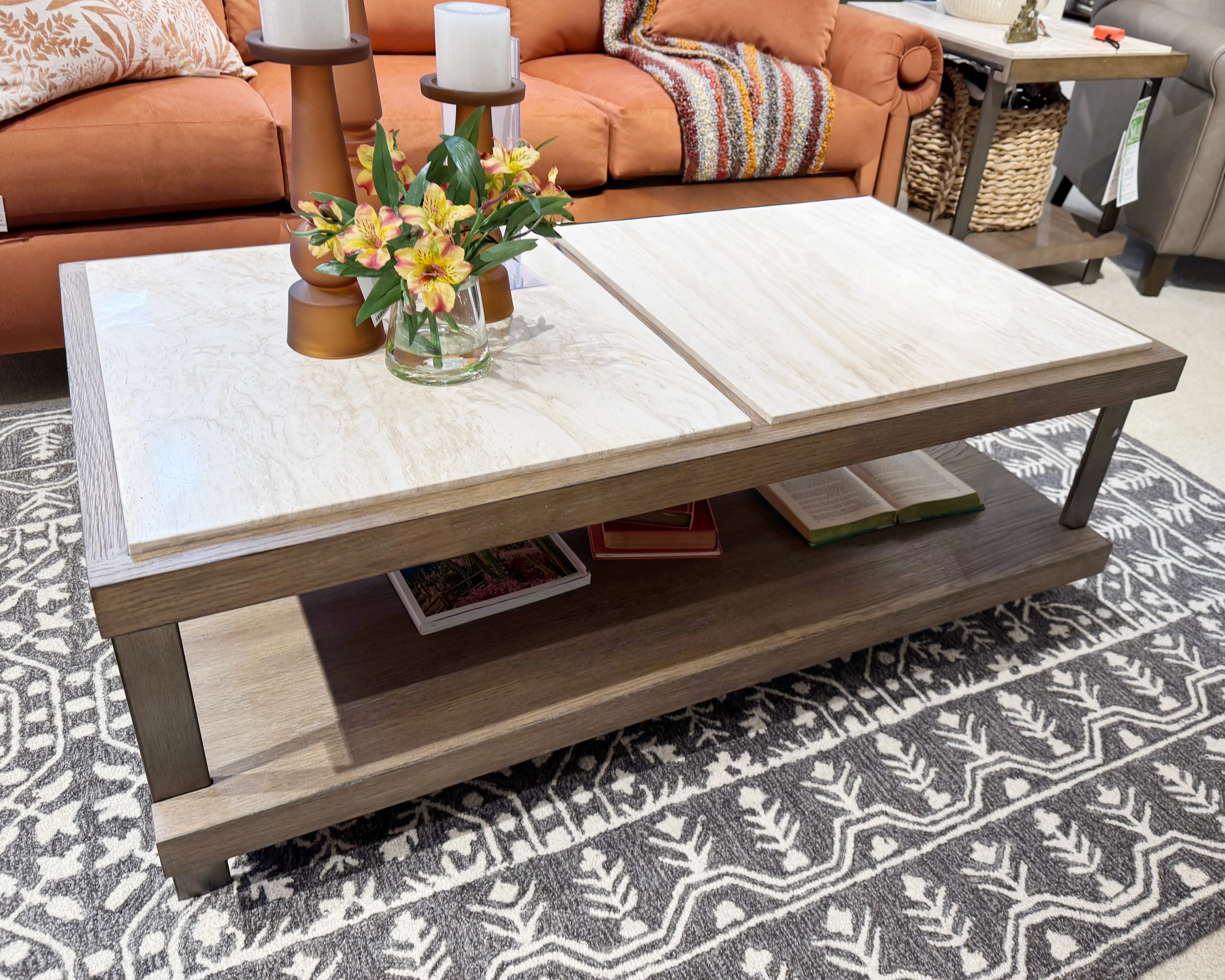 Item #: 034-910The Amara Rectangular Coffee table is made of Quartered Oak Veneers and Rubberwood solids. It has a travertine marble top with metal legs and one wood shelf. Some assembly is required.