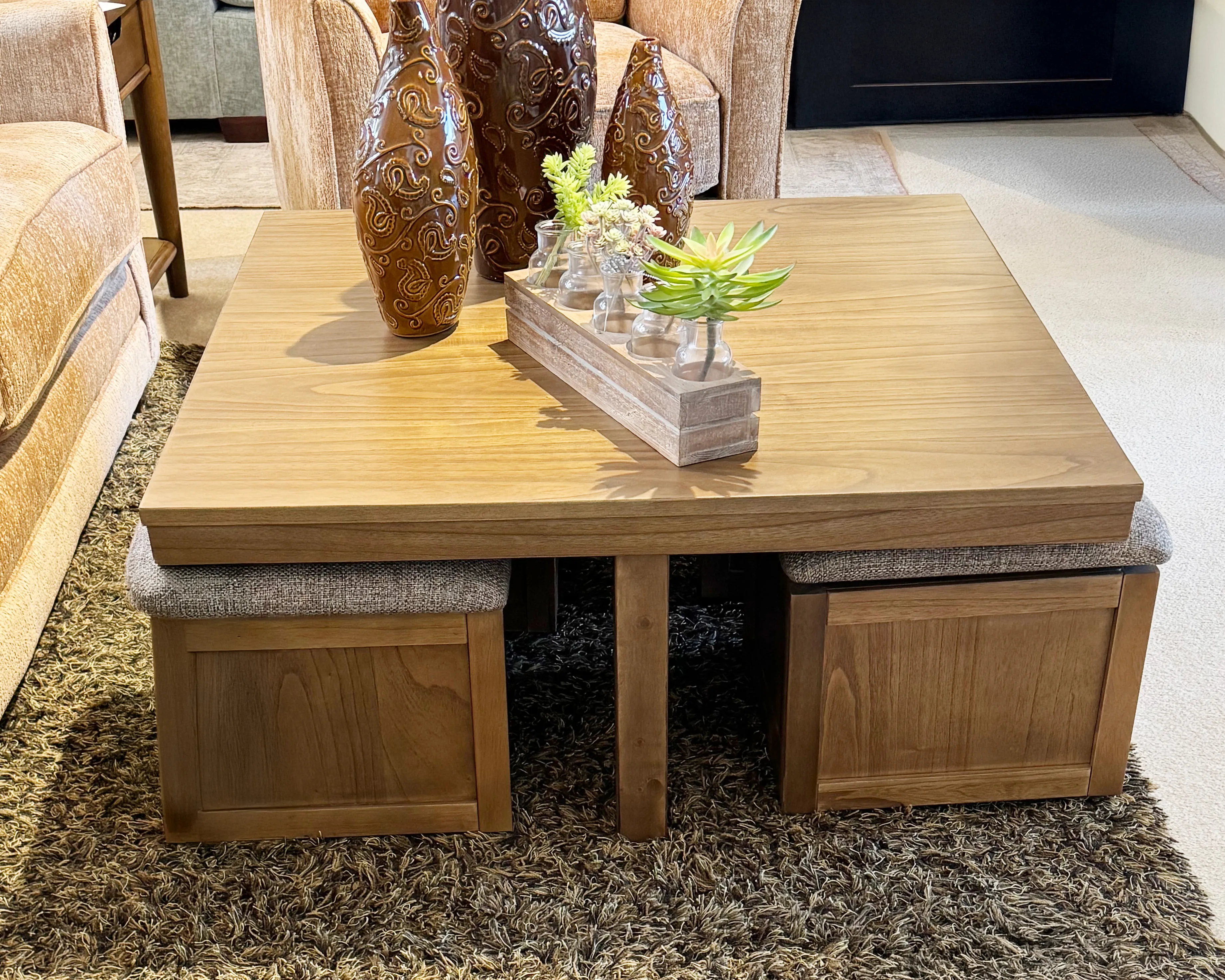 Elevate your entertainment experience with the Boardernest coffee table with stools. A functional companion for your seating area, it’s defined by a richly versatile finish. Instantly upgrade game days and movie nights—the four stools wheel out easily with casters, tucking away neatly under the table when you’re done. And with storage under the top of each stool, you can keep essentials on hand and out of sight.