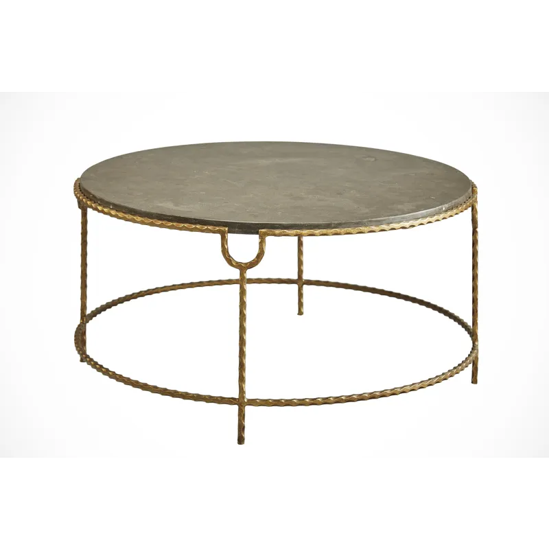 Taking its cues from today's high fashion jewelry which combines organic stones with burnished metals, this stunning table features an eye catching frame of crimped iron with a satin gold finish and a solid bluestone top. Looks even better paired with the side table, 20-177 and console, 20-259.