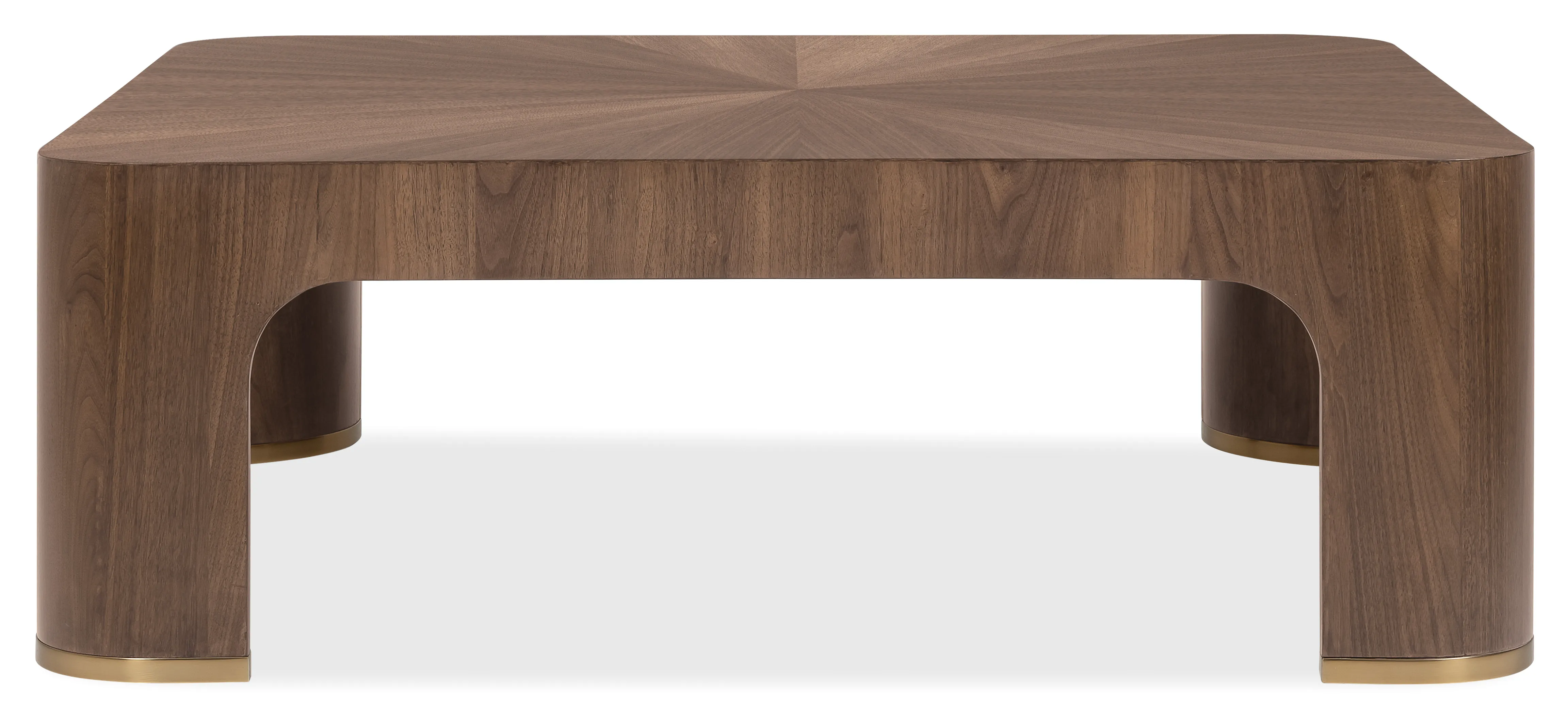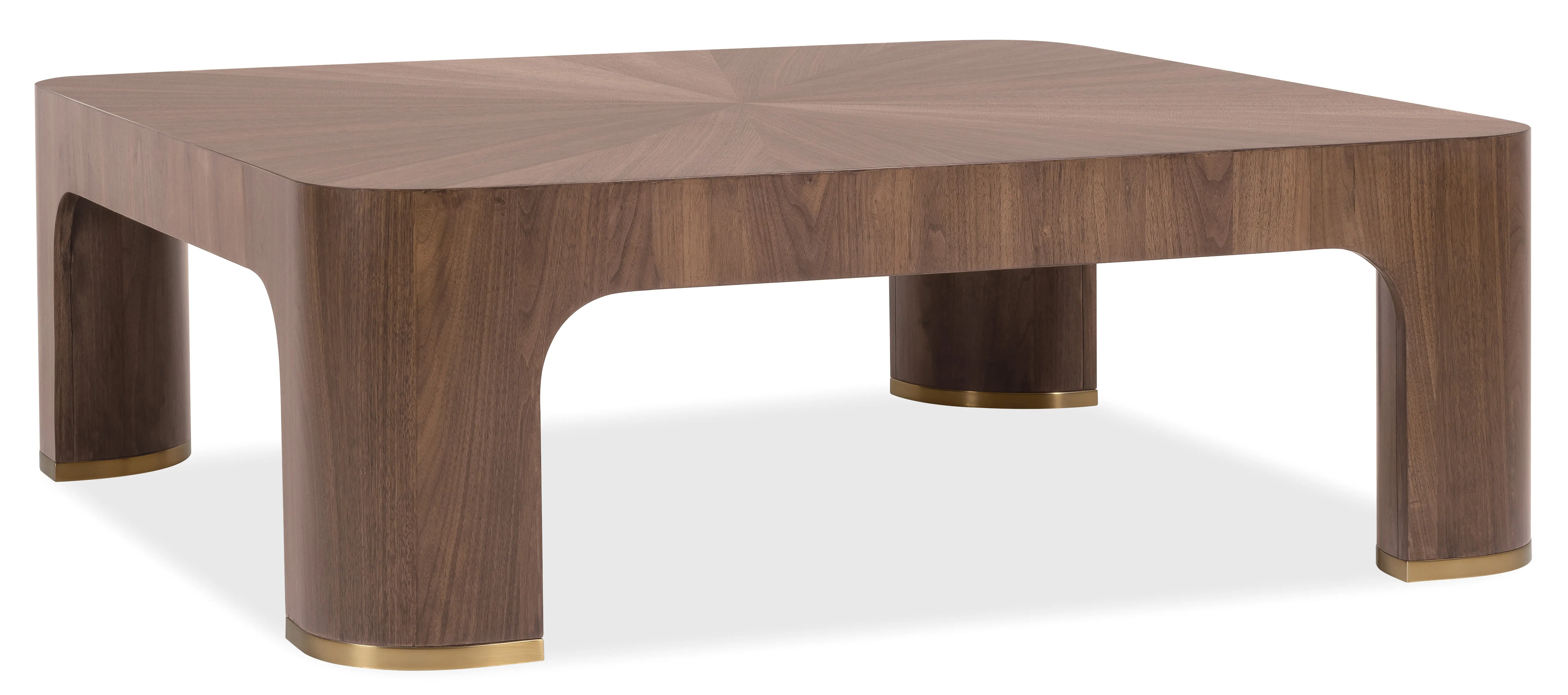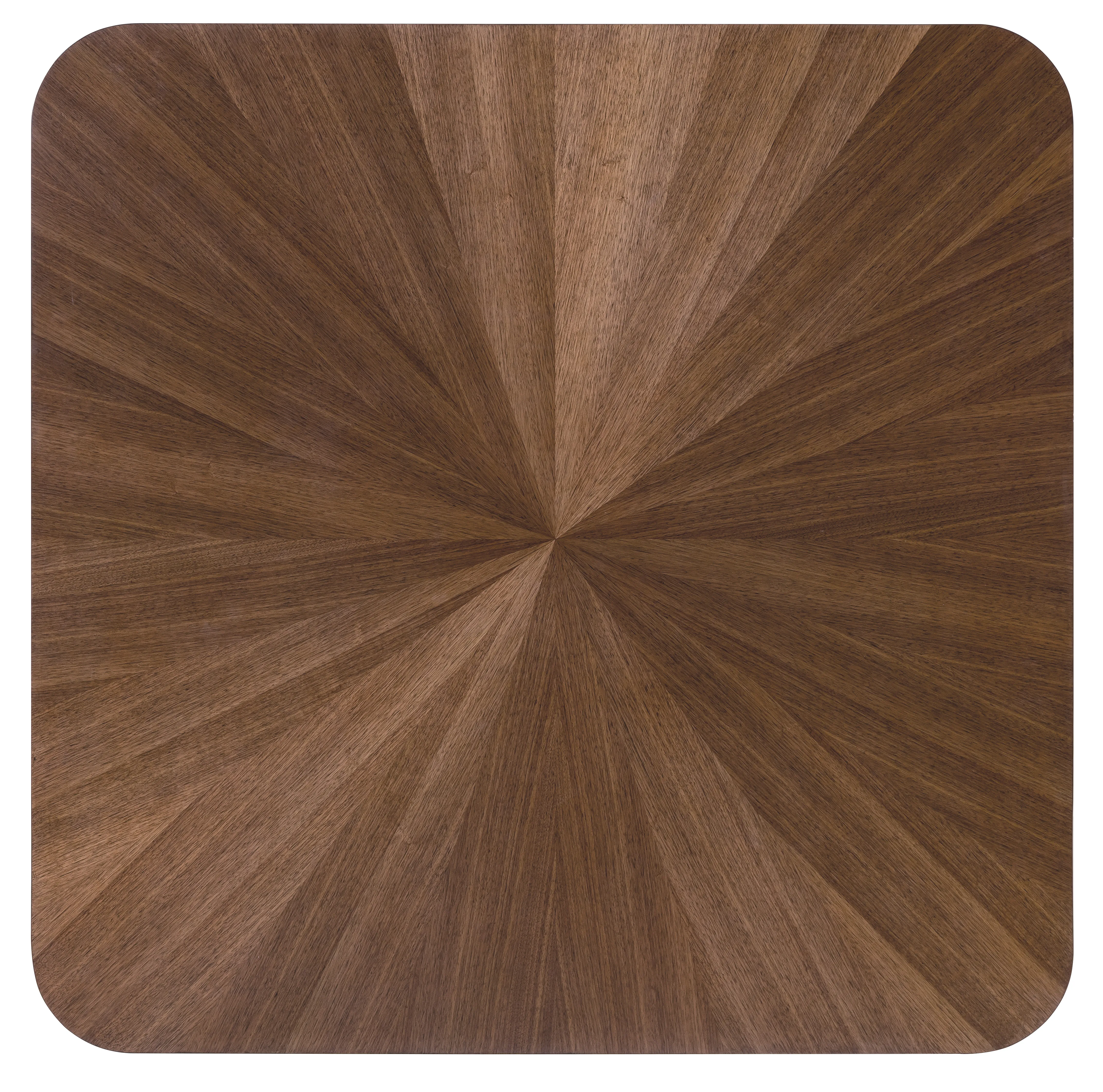 The Eleana Cocktail Table is a sophisticated square walnut coffee table designed to anchor transitional living spaces with warm, modern elegance. Crafted from split-heart and quartered walnut veneers in a Light Caramel finish, the top showcases a striking starburst veneer pattern, while softly curved edges and Sunlit Bronze metal leg accents add refined designer detail. A standout transitional cocktail table that blends artistry and everyday function.