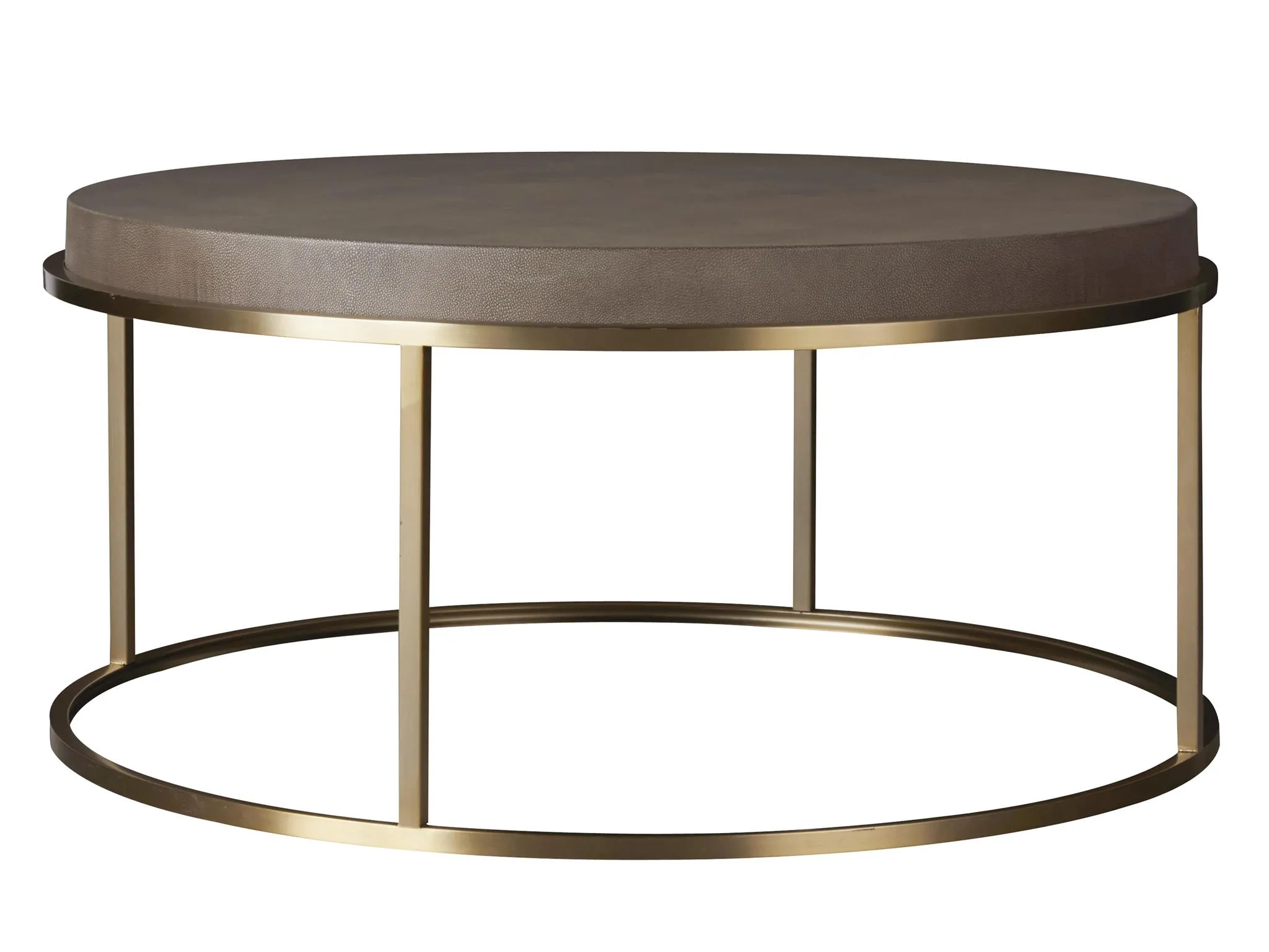 The stylish Bennett Round Cocktail Table showcases a beautiful blending of textures, with a faux shagreen top and a radiant brushed brass base.