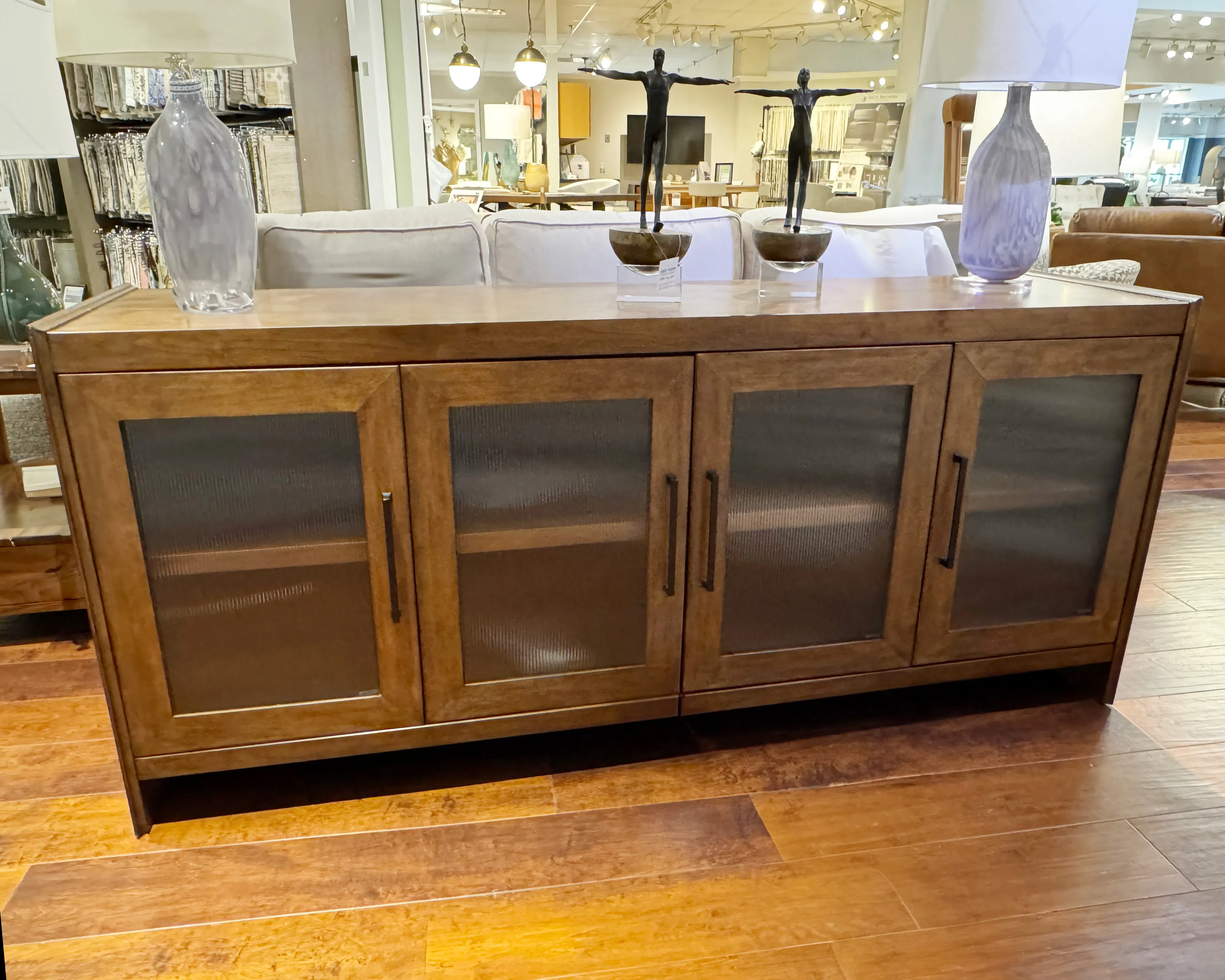 The Wagner Four Door Console is designed to function well in a variety of settings. Shown here as a large entertainment console, it can be used alone or flanked by one - or more - of the Wagner Cabinet for larger spaces. It uses framed, fluted glass on the door fronts to maintain a clean, transitional style. Behind the two middle doors is a single, large open space with one adjustable shelf. There is also an adjustable shelf behind each of the two end doors. And to assist with electronics, there is an electrical outlet integrated into the back of the piece.