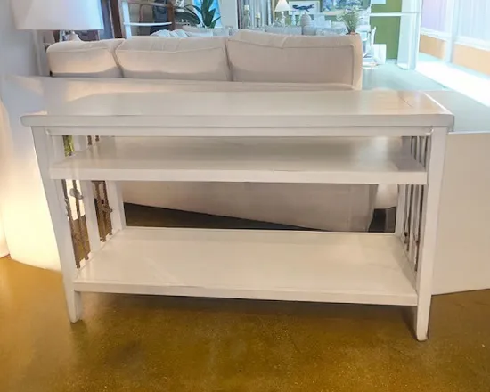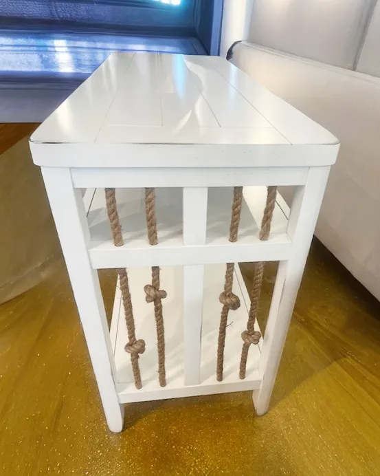 Enhance your space with the coastal style Dockside II sofa table. Crafted of poplar solids and birch veneers, this piece features a white finish with knotted rope end panels and wormhole distressing, appealing planked top with an open shelf design for additional storage, softly rounded pilasters flow into tapered feet. Add this eclectic, one of a kind table to any casual style space.