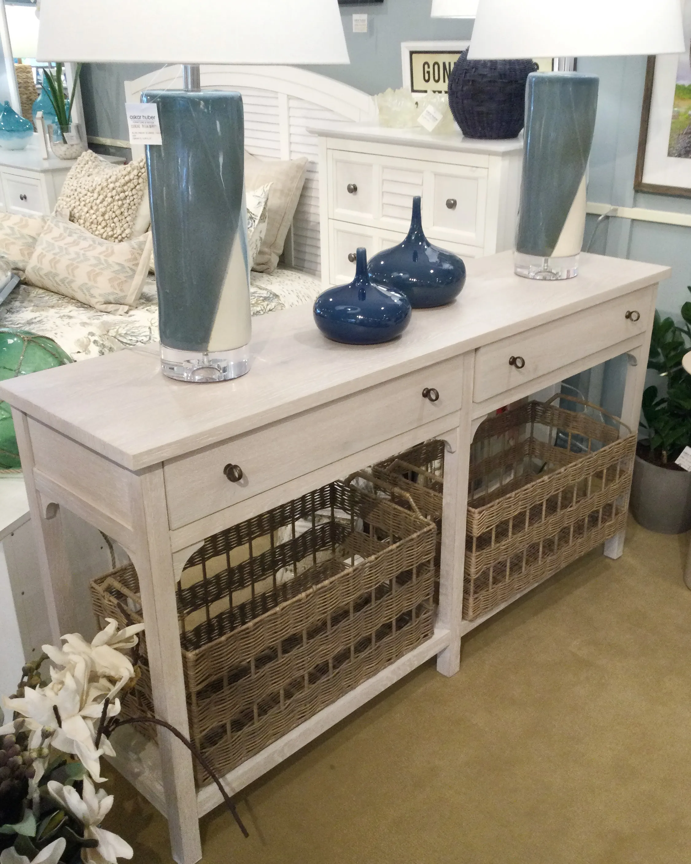 Bursting with charm, the Kinsley Console Table offers functional storage and texture to spaces with two drawers and two spacious woven baskets, conveniently stored on a lower open-air shelf.