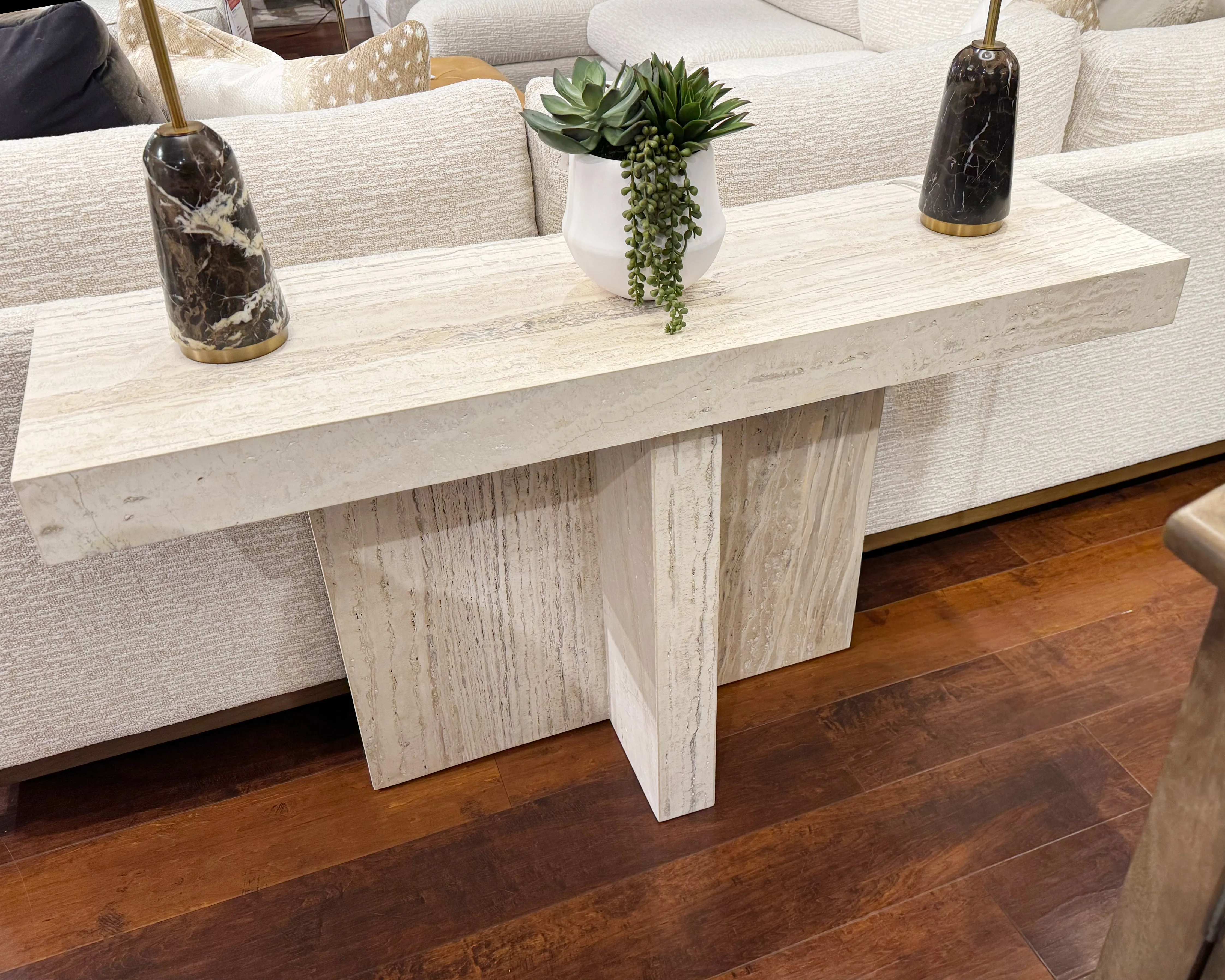 The Daxton Console Table stands out with its T-shaped silhouette, carved entirely from White Travertine. Its design is characterized by angular lines and sharp, cool edges, presenting a piece that exudes a minimalist yet bold aesthetic, perfectly suited for contemporary spaces that embrace clean, architectural forms.