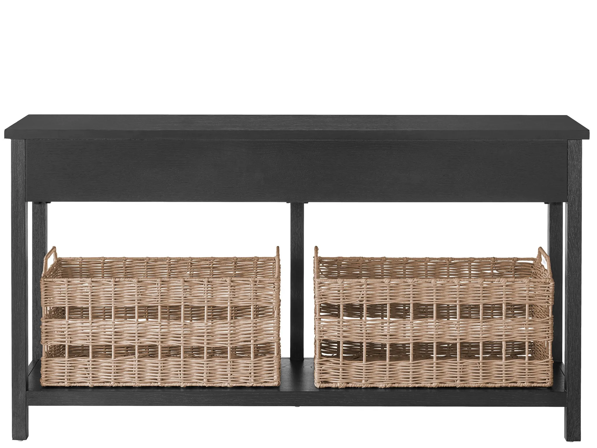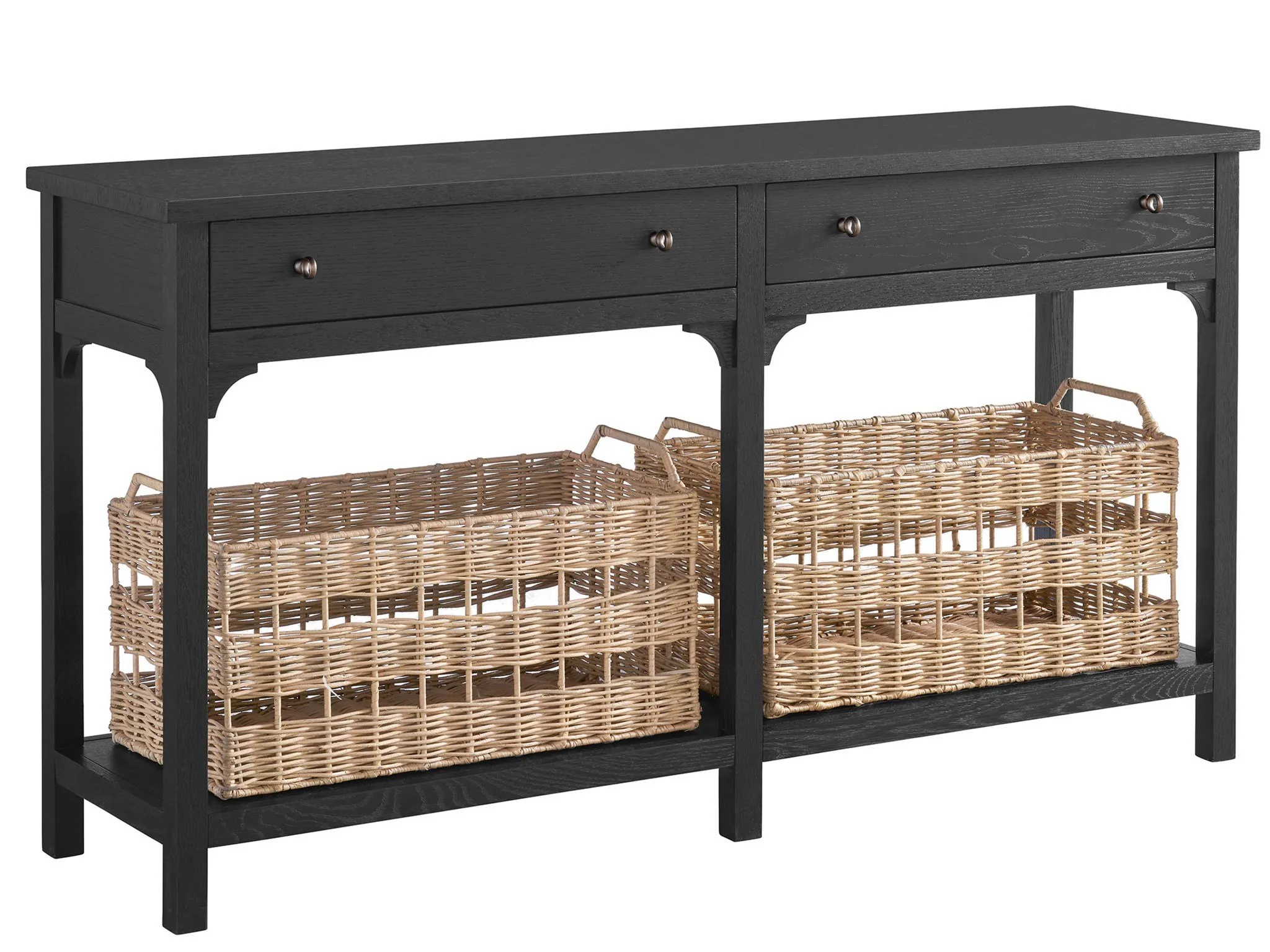 Bursting with charm, the Kinsley Console Table offers functional storage and texture to spaces with two drawers and two spacious woven baskets, conveniently stored on a lower open-air shelf.