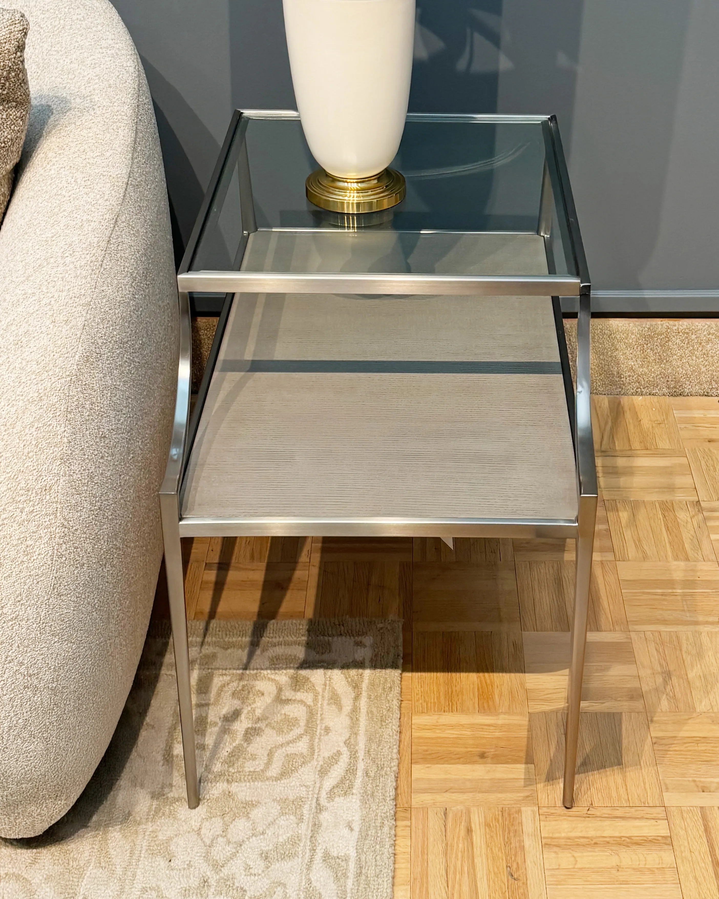 Sleek and elegant, the bi-level Cornelia side table offers a streamlined profile in cast brushed stainless steel. Slim tapered legs support a wood shelf in the Nebbia finish that extends beyond the glass top.