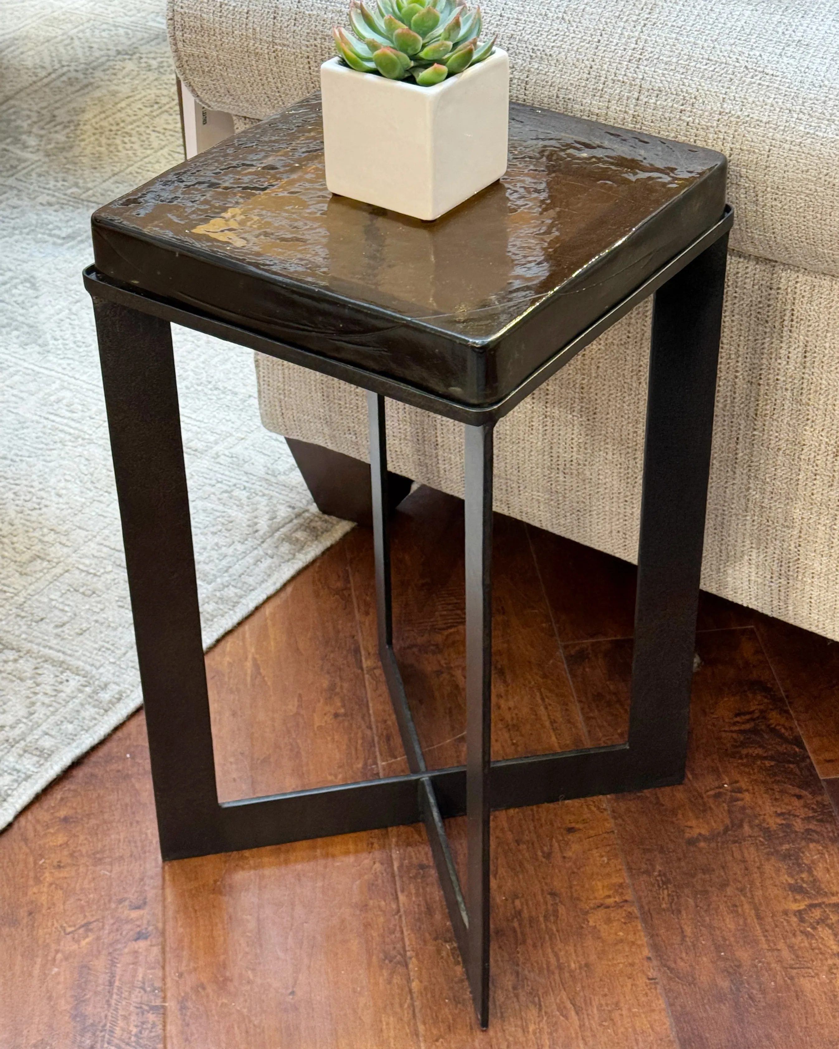 An airy, angular base of charcoal-burnished iron supports a squared tabletop of amber cast glass, perfectly sized to keep your drink or book within reach.