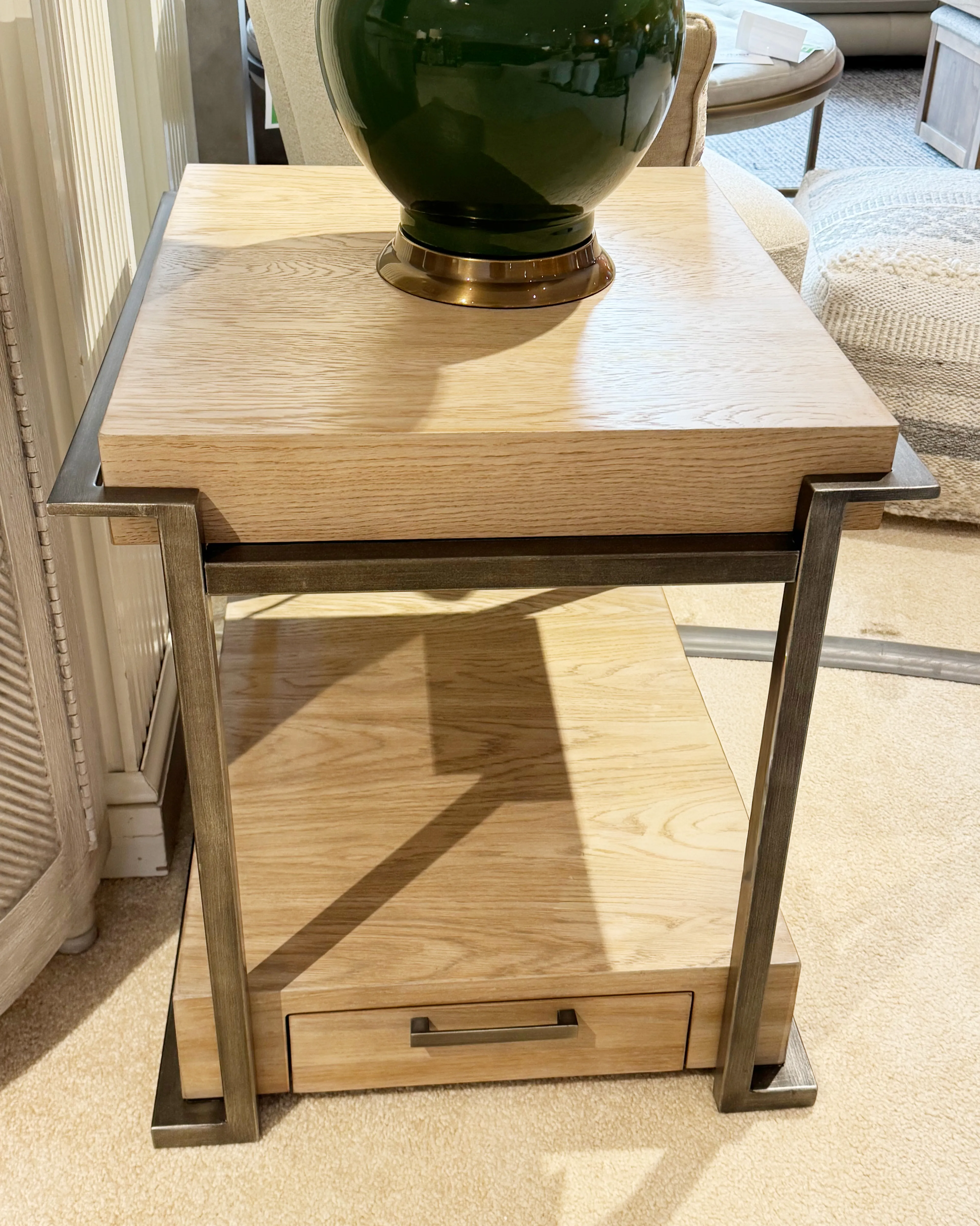 The Huron occasional collection was inspired by the Prairie Style movement and the work of Louis H. Sullivan, who mentored Frank Lloyd Wright. Each table is designed using a metal frame that supports two thick oak horizontal bands of wood with cantilevered ends.