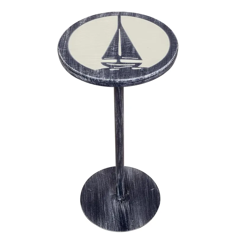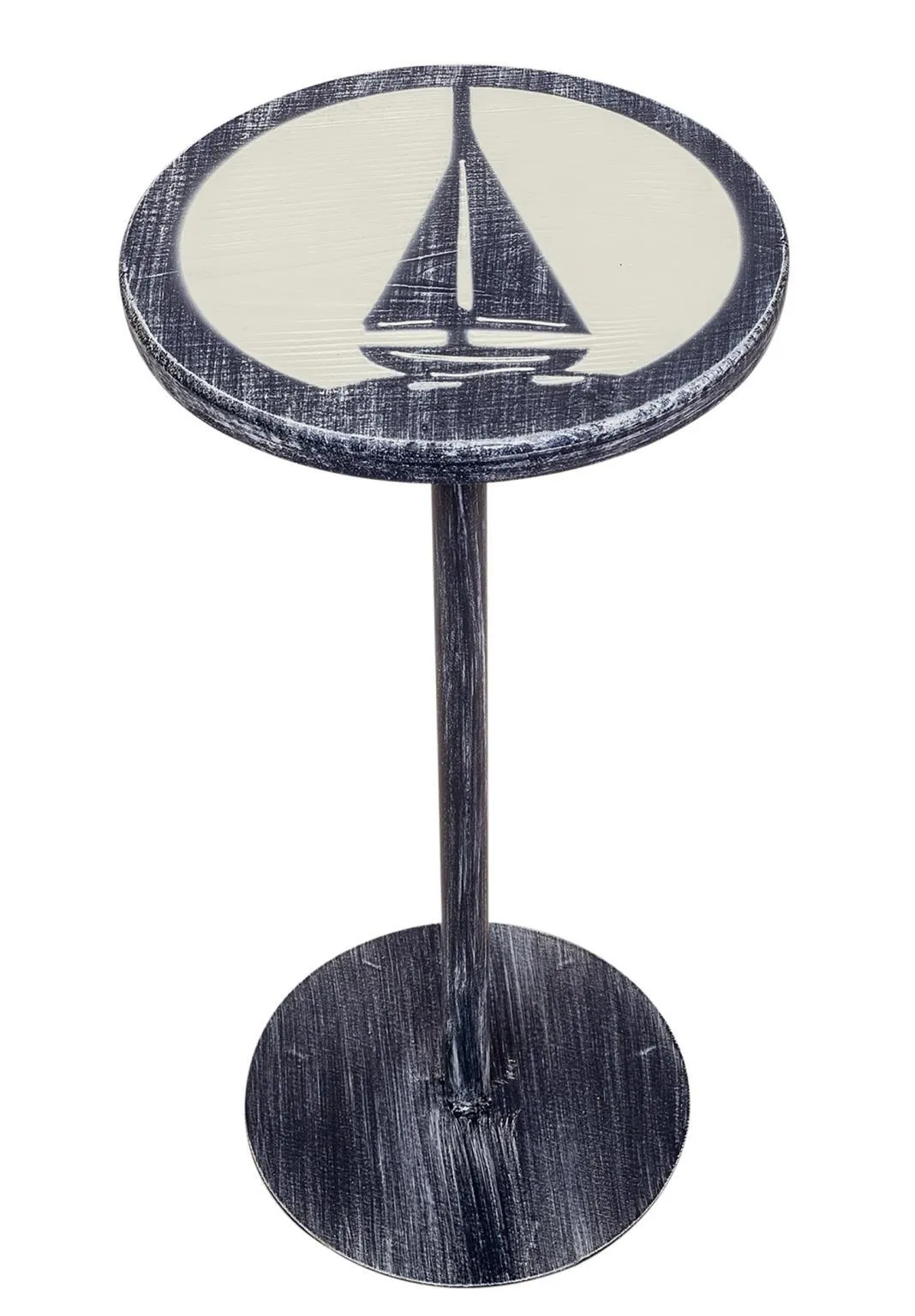 Weathered Navy/Cottage Round Wooden Top Drink Table with Etched Sailboat Accent