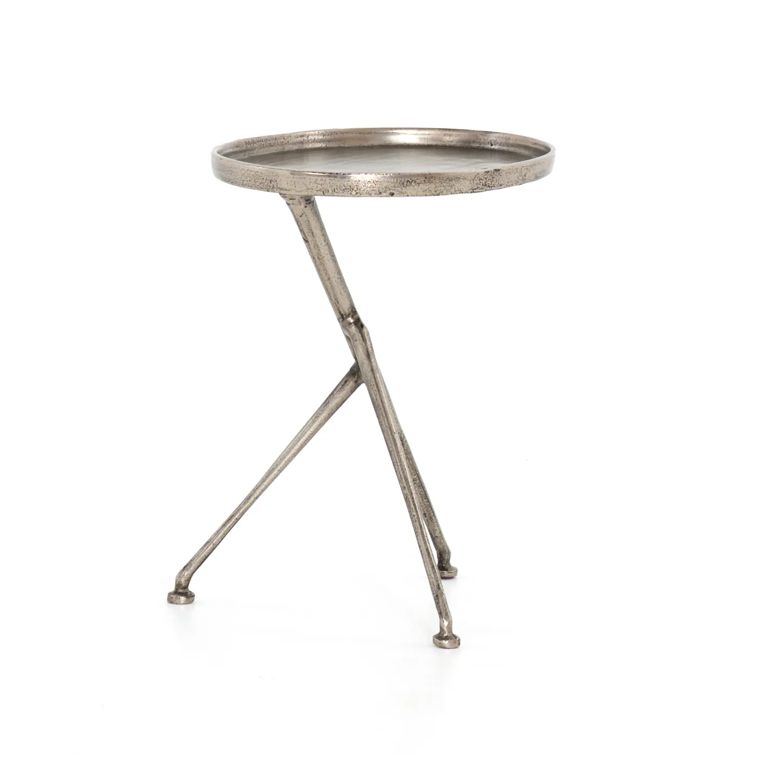 The tripod table with a cleverly balanced twist. Angular cast aluminum is finished in raw antique nickel to bring out highs and lows. Great indoors or out- cover or store indoors during inclement weather and when not in use.