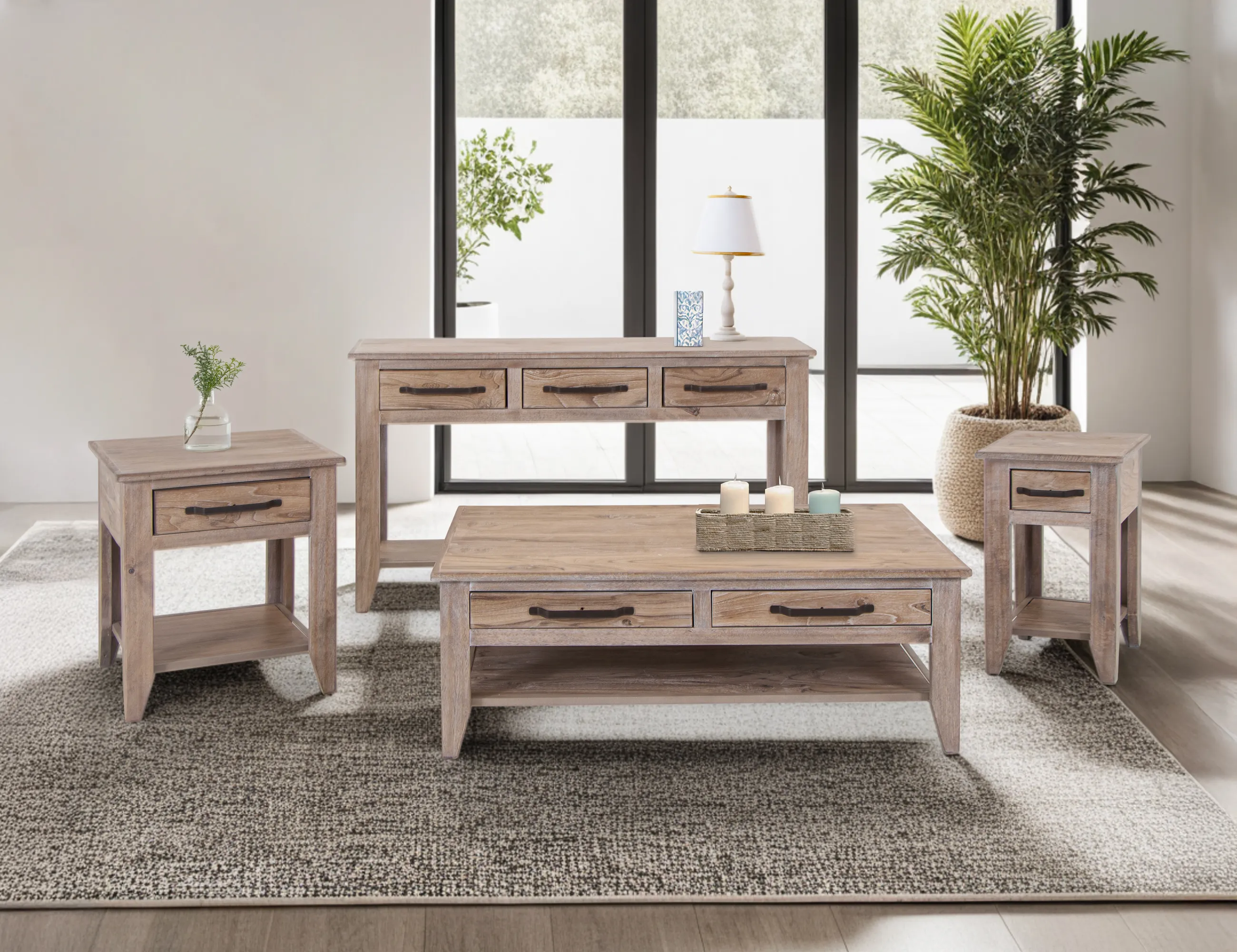 - Crafted of sustainable mango, melina and engineered teak.