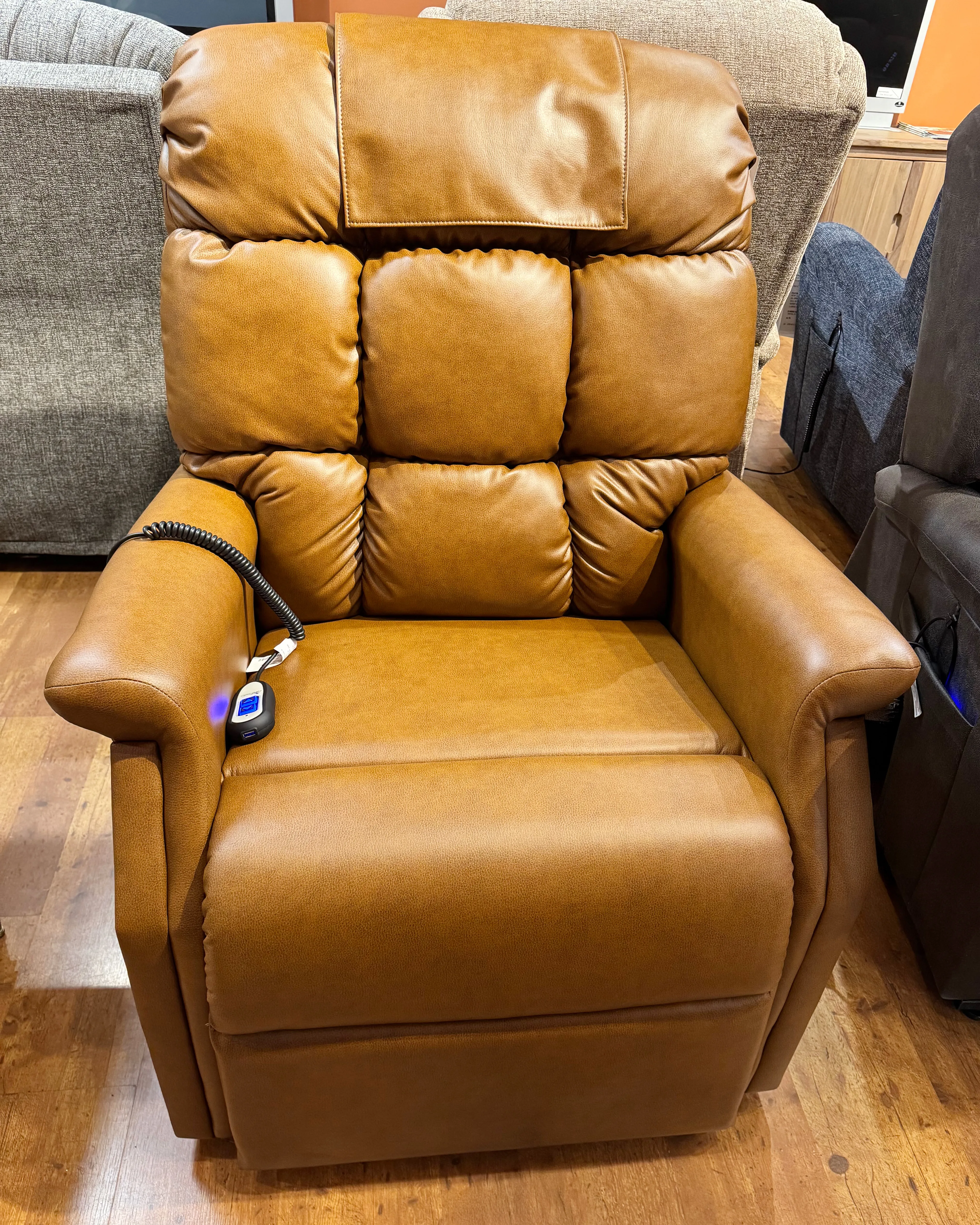 The Aurora power lift recliner combines timeless style with exceptional comfort. Featuring a supportive biscuit backrest and a plush, cushioned seat, it’s designed for hours of relaxation. Available in three sizes, this recliner offers a seamless reclining experience with a simple two-button hand control, effortlessly transitioning you from sitting to reclining – all while providing full-body support.