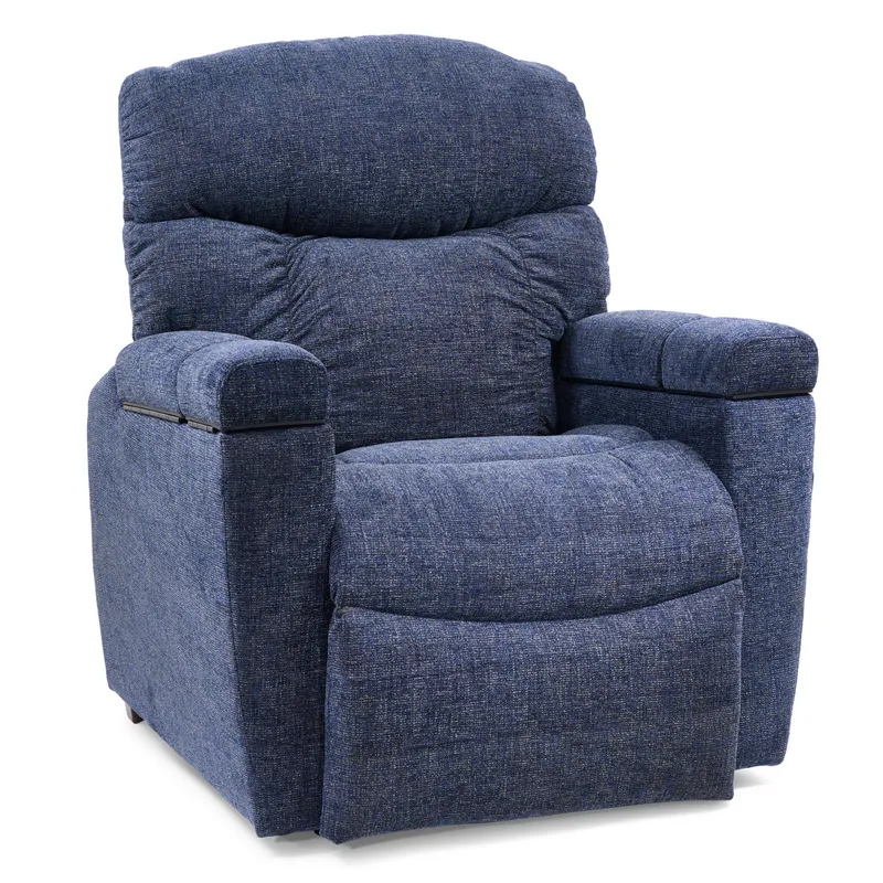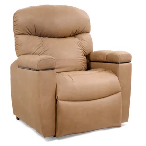 Right arm compartments feature the hand control dock, wireless phone charger, and power port that holds either the LED reading light or removeable butler tray table that come standard. Left arm compartments feature a drink holder, USB charging port and more storage. In addition, you can choose from an exciting array of optional accessories including a Bluetooth speaker, tablet holder, flex light, color-changing snack bowl, fan, and diffuser.