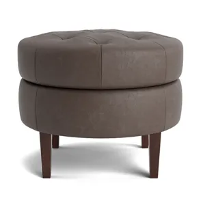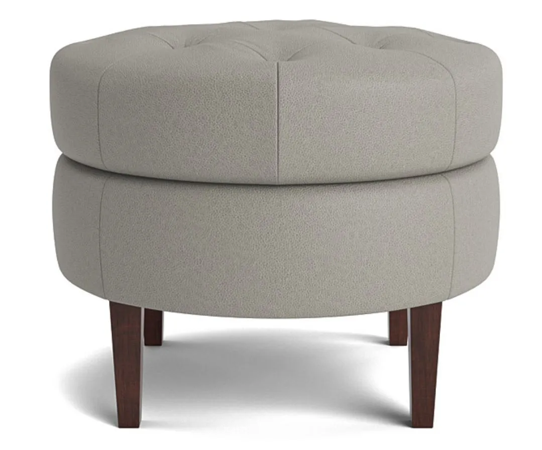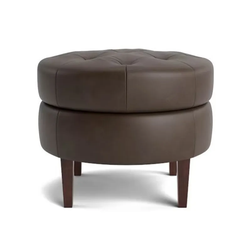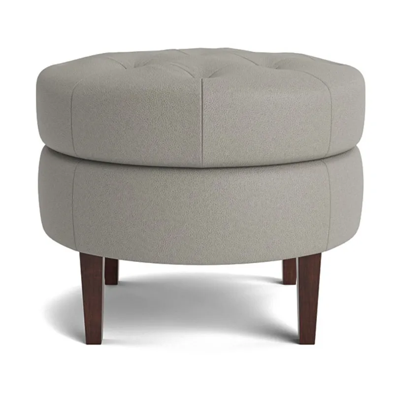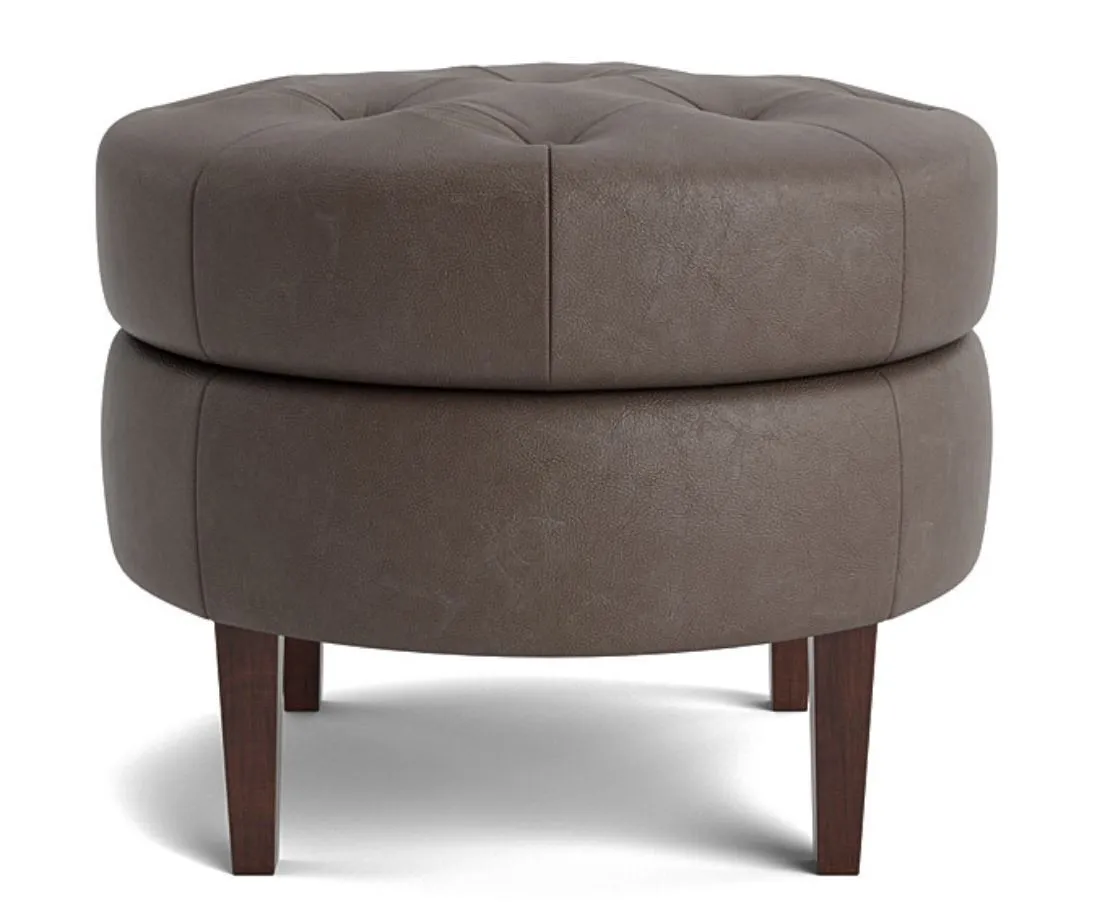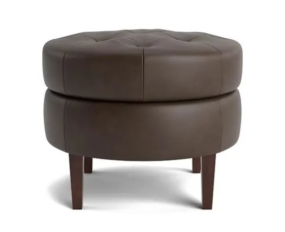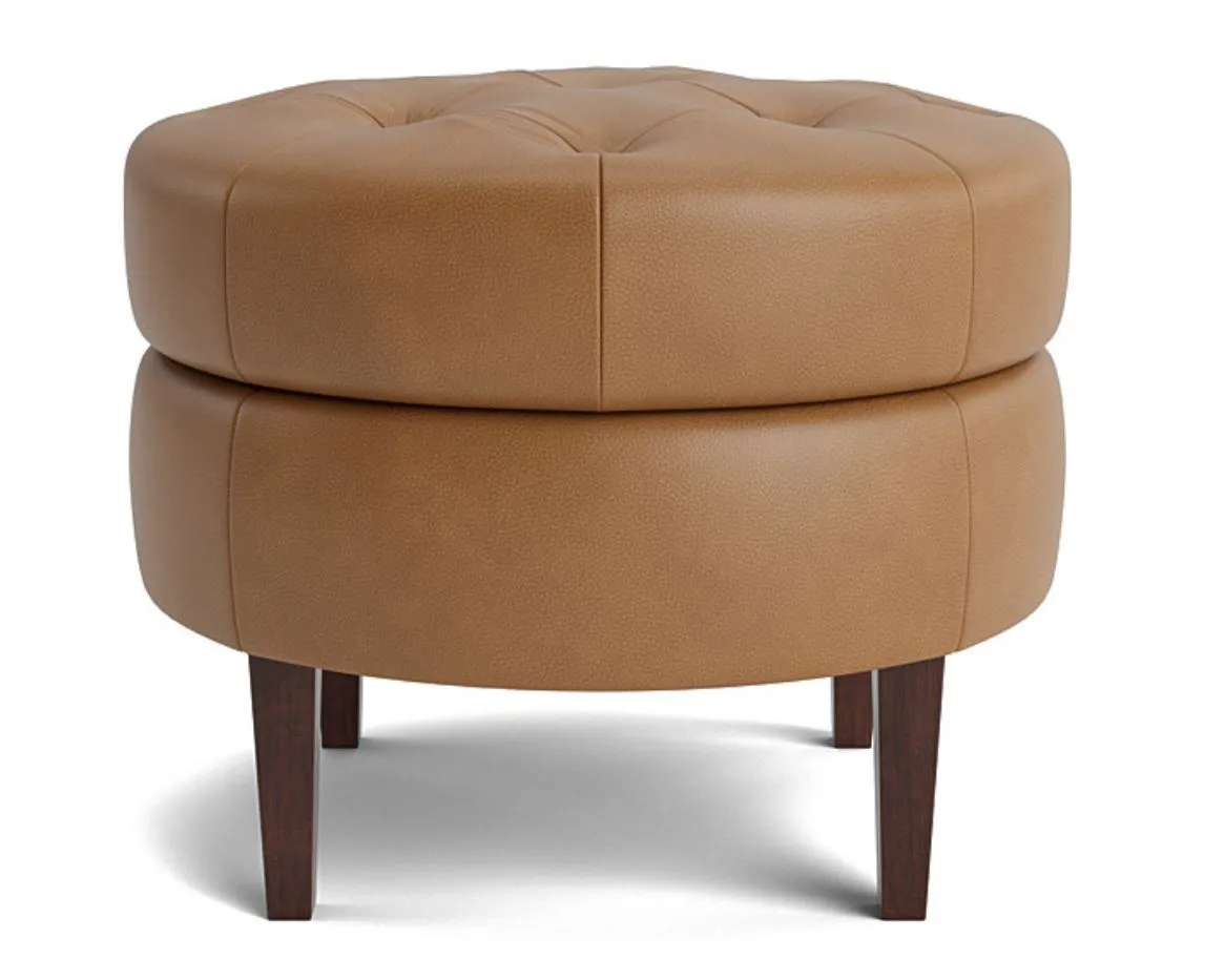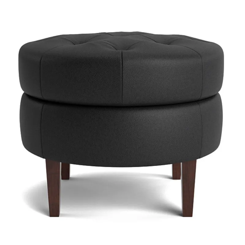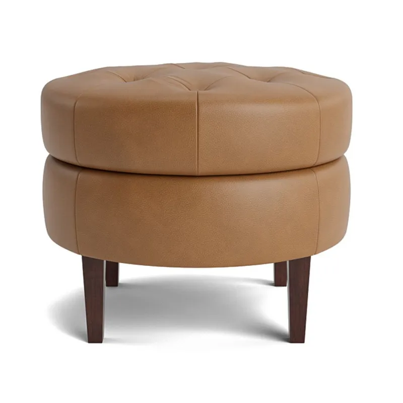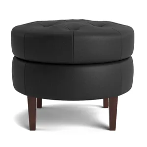 An ottoman completes the room. A Delway Round Leather Ottoman does that and so much more. Completely customized to your liking, this ottoman complements your sofa or sectional or adds a playful contrast that ties it all together. Webbed seating construction means you can comfortably settle your feet or a decorative tray, or even use it as a seat. A tufted top and tall, tapered wood legs in a walnut finish give it a clean look. Choose your leather from a range of possibilities.