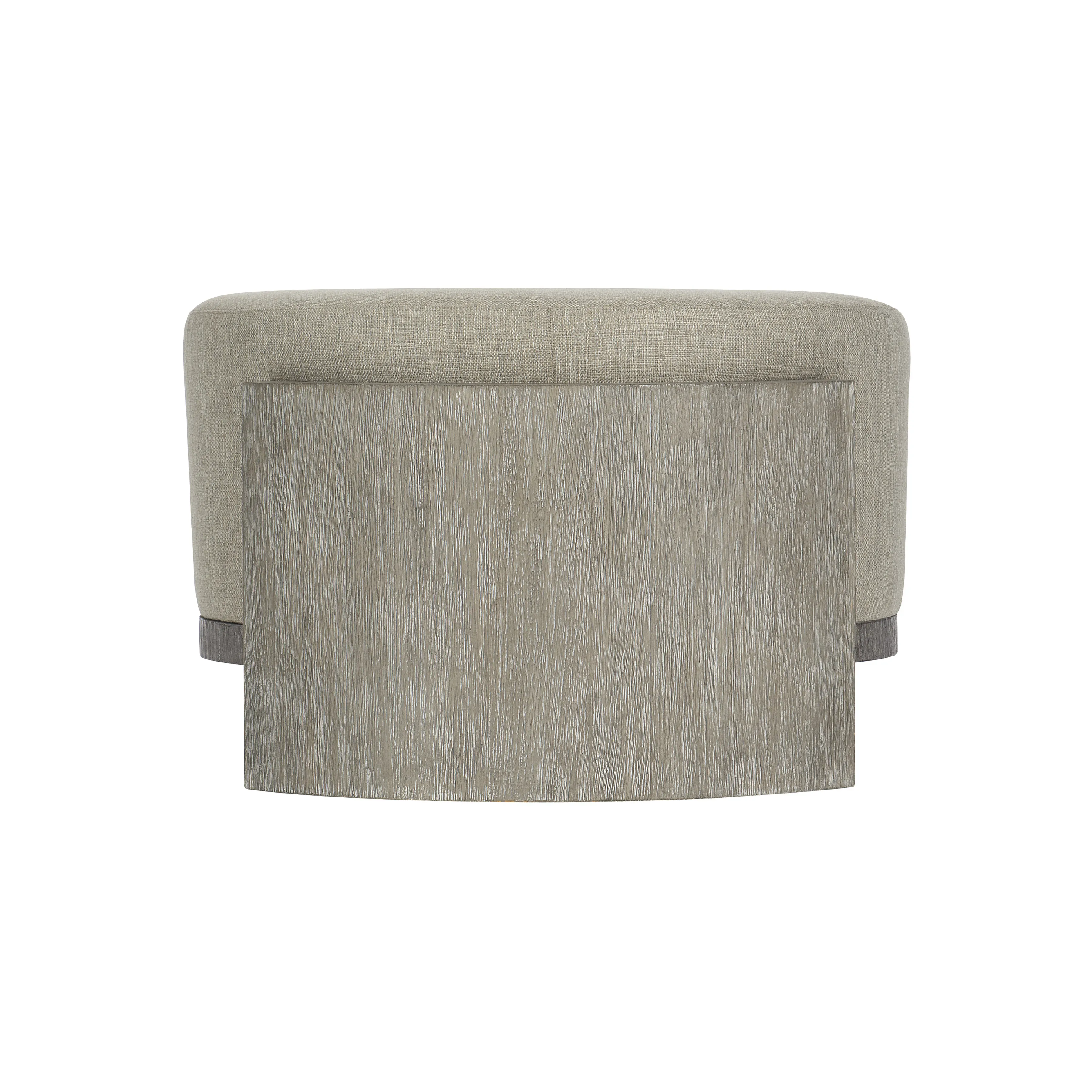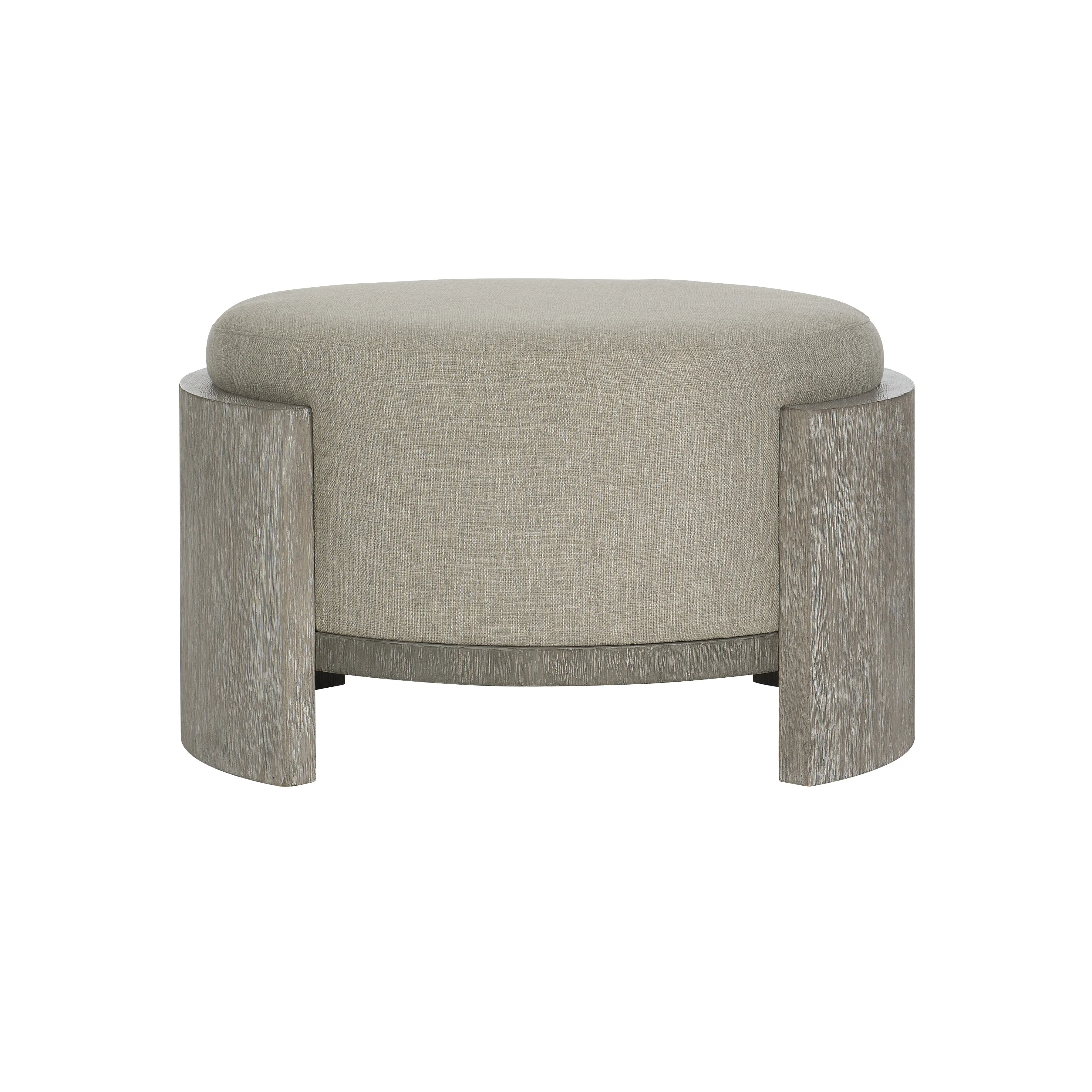 Foundations is a new, refined expression of modern rustic, defined by a minimalist style and relaxed comfort. The Foundations cocktail ottoman features weathered acacia in its distinctly modern design. The round, fully upholstered seat is nestled inside a base constructed from two semi-circular columns. This stylish piece exudes a warm and welcoming feel.