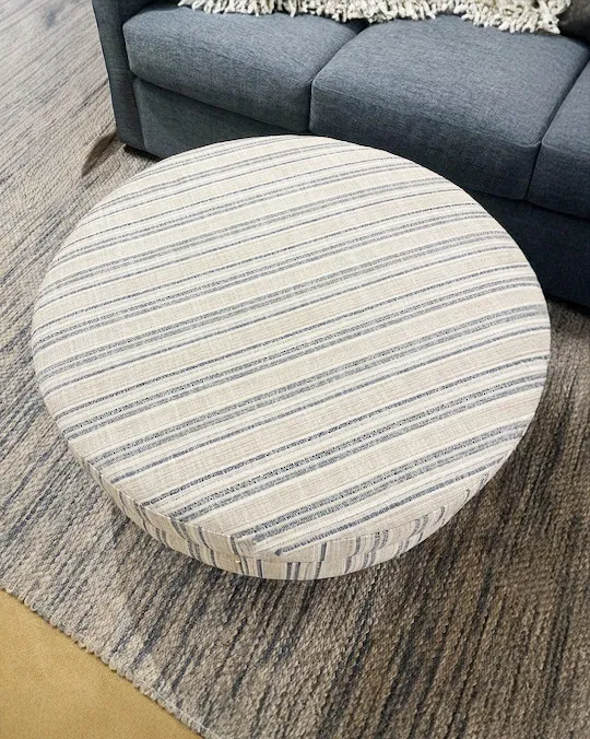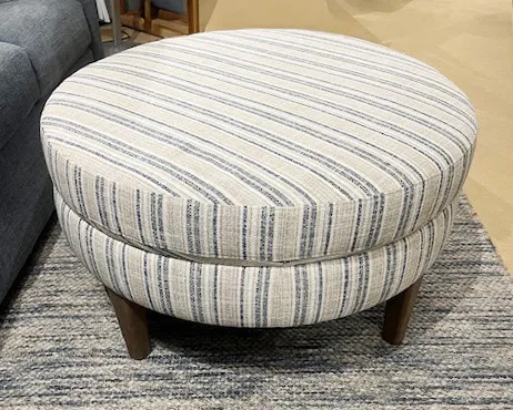 An ottoman completes the room. A Delway Round Ottoman does that and so much more. Completely customized to your liking, this ottoman complements your sofa or sectional or adds a playful contrast that ties it all together. Webbed seating construction means you can comfortably settle your feet or a decorative tray, or even use it as a seat. A smooth, top-stitched or tufted top and tall, tapered wood legs in a walnut finish give it a clean look. Choose your fabric from a range of possibilities.