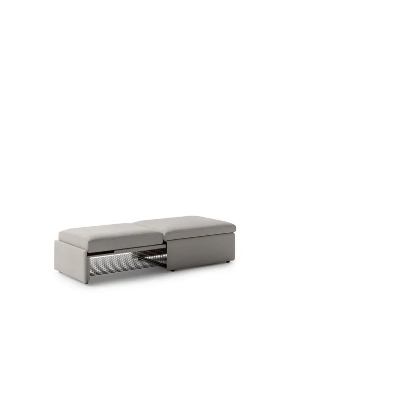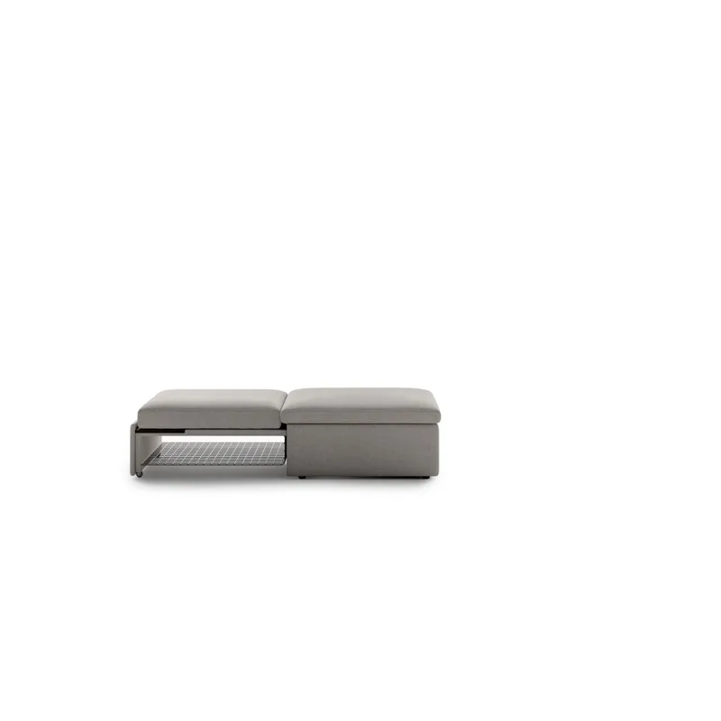 The convertible ottoman sleeper provides versatile solutions for modern living, featuring an integrated coffee table surface and mattress section storage.