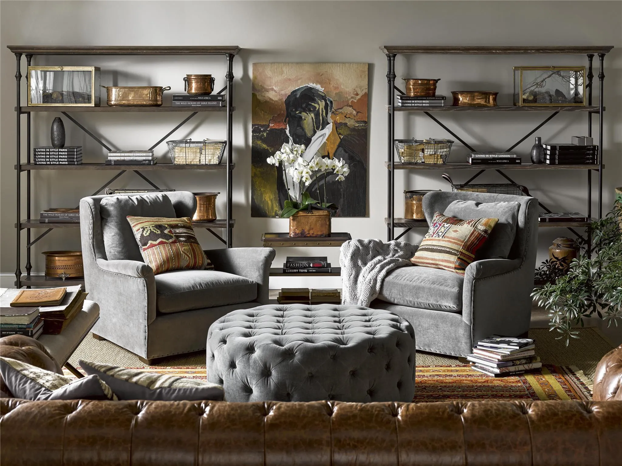 Definitively the hallmark of any living space, the lush Aberdeen Ottoman is fully upholstered in a Grey Cloud Velvet and accented with a deep Brownstone finish.