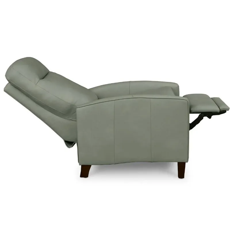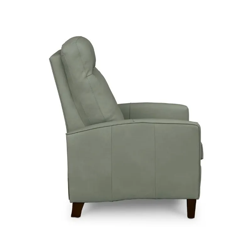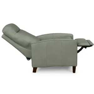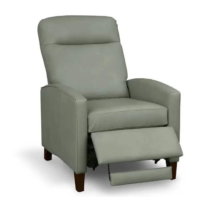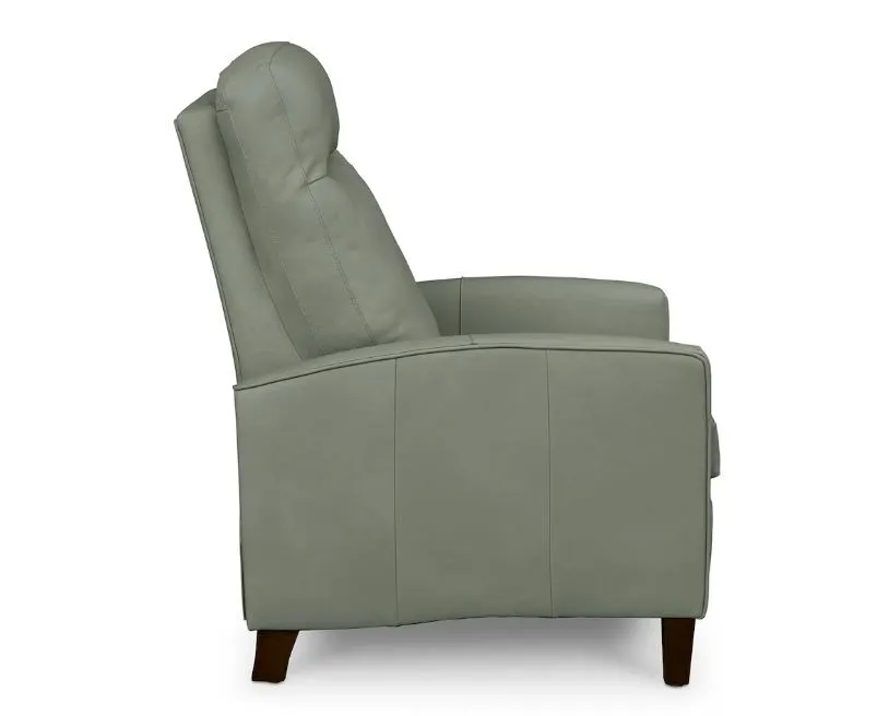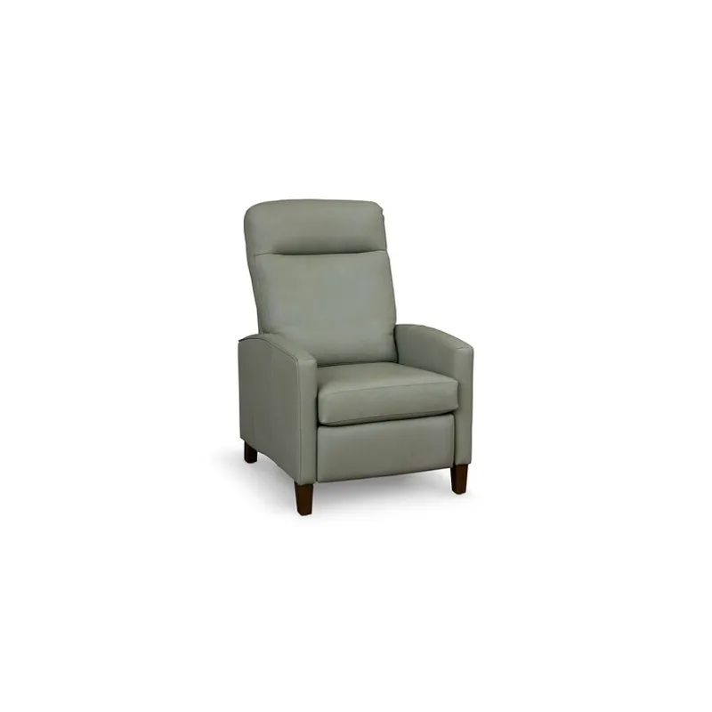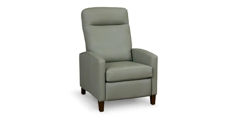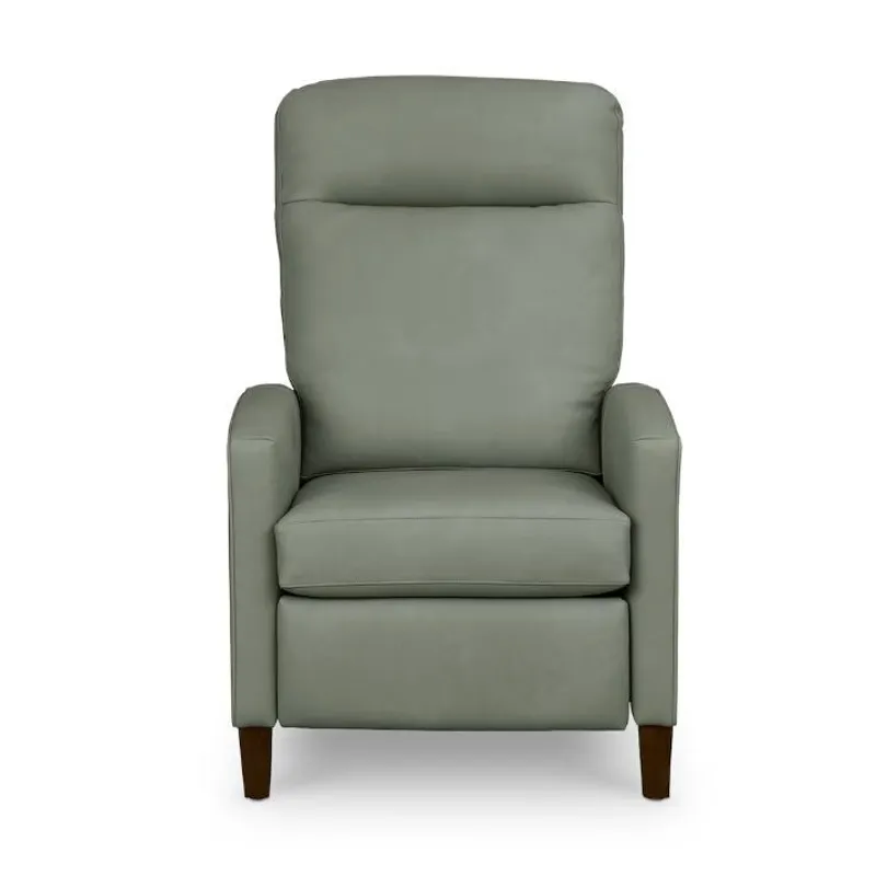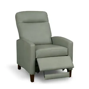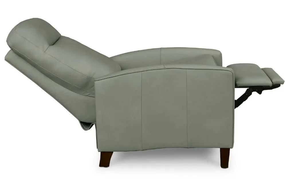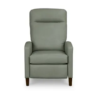 Our Emmett Leather Track Arm Lay Flat Power Recliner operates undercover to deliver reclining relaxation to your modern living room. With a channeled headrest and tapered wood legs, Emmett’s accent-chair appearance camouflages the heart (and mechanics) of true reclining comfort. Style the chair in your preference of any fine Bassett leather, cushion the seat to your comfort level, and choose a finish for its legs. The Emmett recliner is also available at either standard or tall back height, with your choice of manual push arm or power mechanism to adjust your recline.