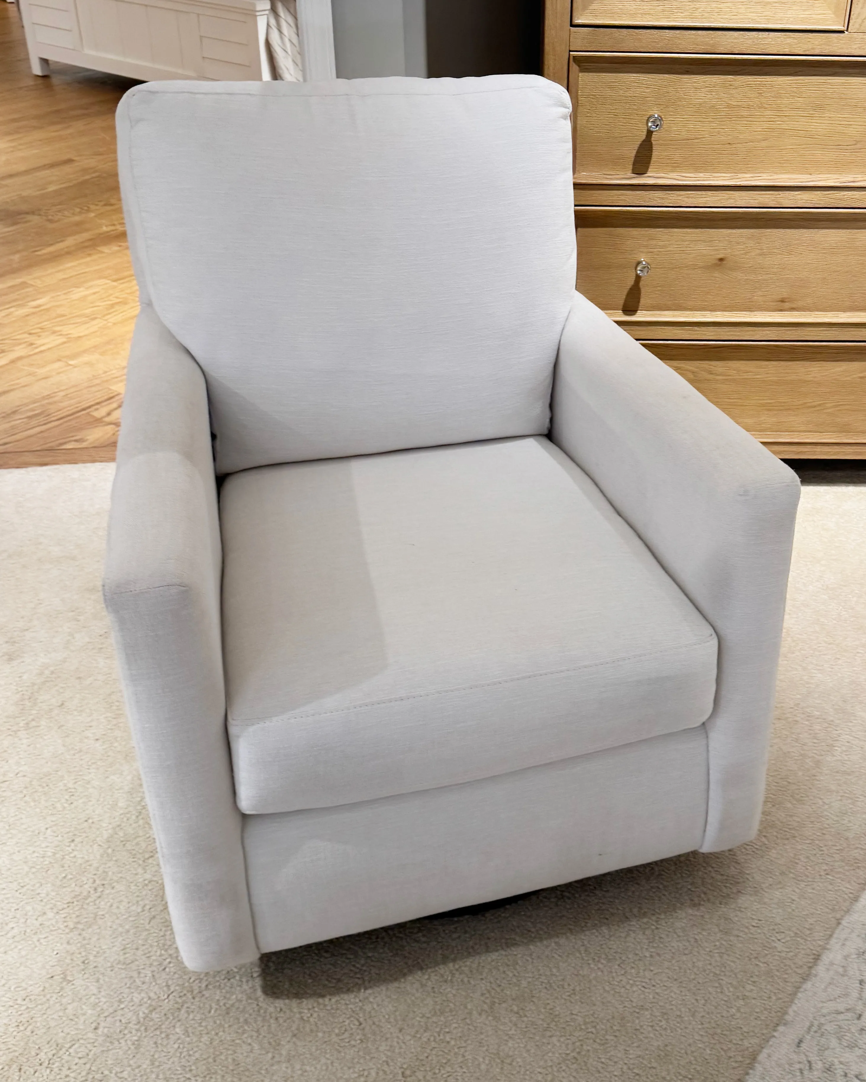 Some chairs just know how to earn a cherished place in your home, like this Trent swivel glider. Chances are you'll make some memories in that chair ? whether you're entertaining guests, reading a book or just admiring a view. And you'll appreciate how the chair's attached back and seat cushions always look good and feel even better. Topstitched box borders and tapered legs lend a timeless quality.