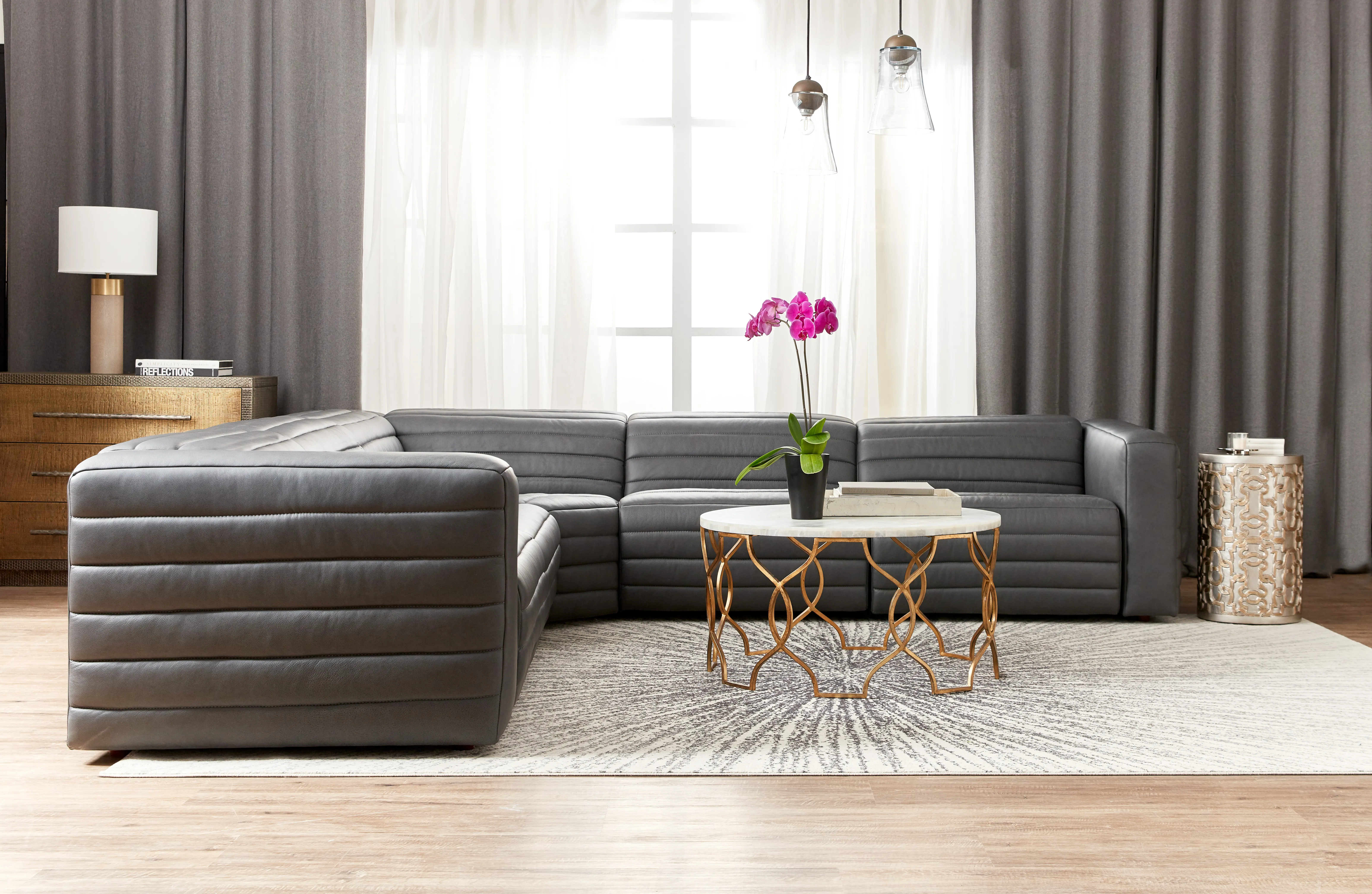 Includes SS454-1.5RL-P-PH-097 Two-piece Sofa, (2) SS454-1.5AL-S-PH-097 Stationary Armless Component, and SS454-PCW-097 Corner Wedge