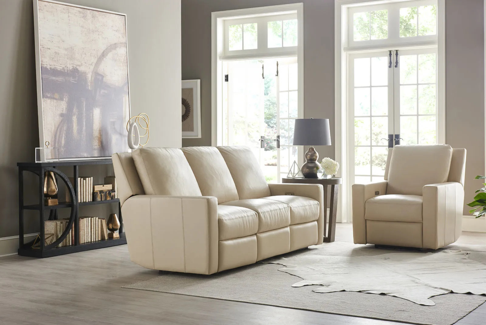 Available in a serene Hudson Ivory leather or a bold Hudson Jet Black leather, the Carter Motion Sofa provides ultimate comfort with plush cushions, a tall back, and simple, angled armrests. The Carter Motion Sofa is outfitted with a state-of-the-art power system, making ultimate comfort easily achievable at the push of a button.