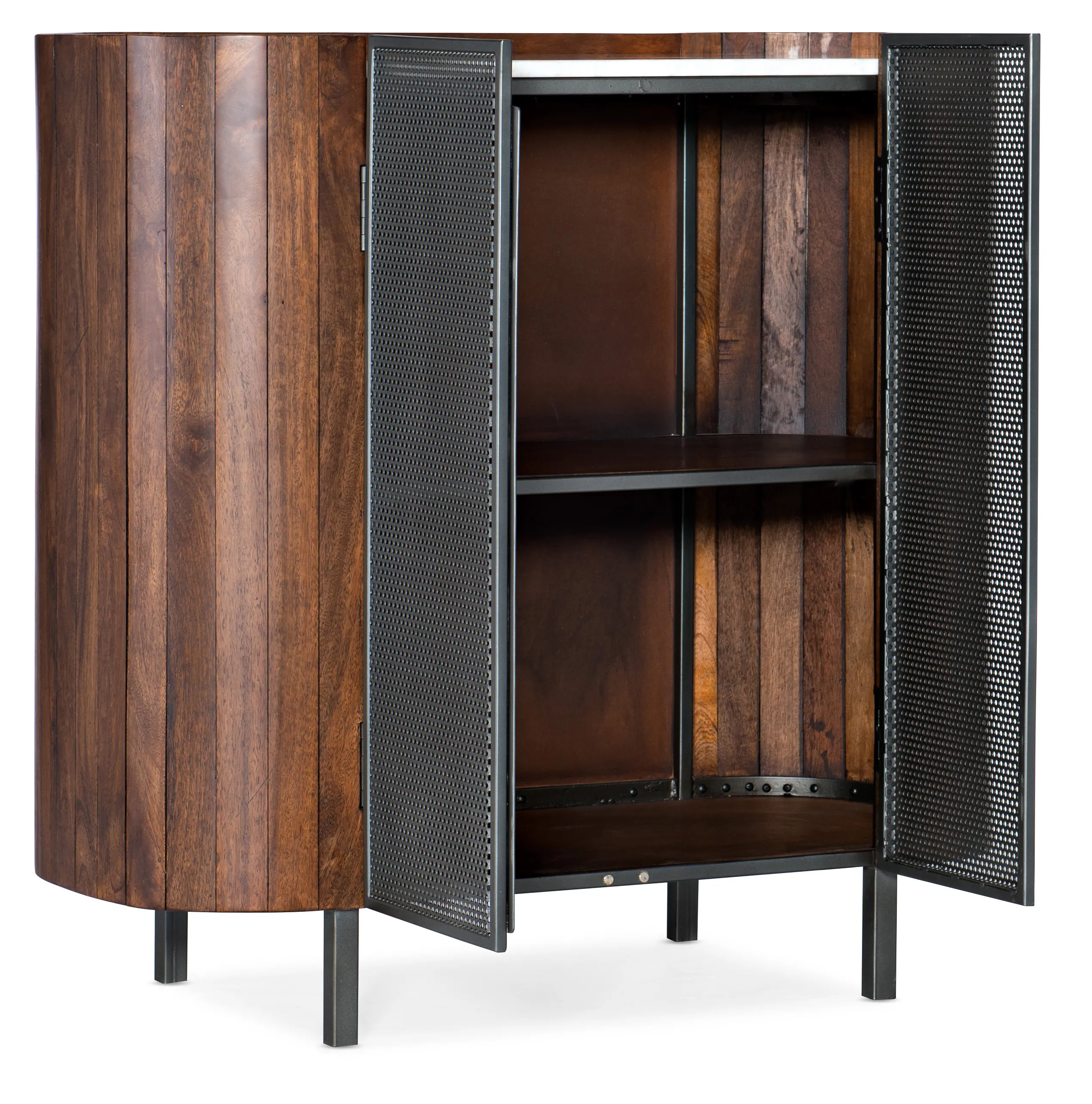 Hooker Furniture uses carefully chosen solid wood and select wood veneers over durable wood products in our furniture construction. Use of veneers enables more decorative looks unattainable with solid wood. Veneers are used over durable wood products such as medium density fiberboard (MDF) and particle board, made of renewable resources. MDF and particle board are used in quality furniture for areas that need to be stable, such as large surfaces. These durable wood products do not expand and contract with heat and cold and do not absorb moisture as much as solid wood, which results in stronger and longer-lasting furniture.