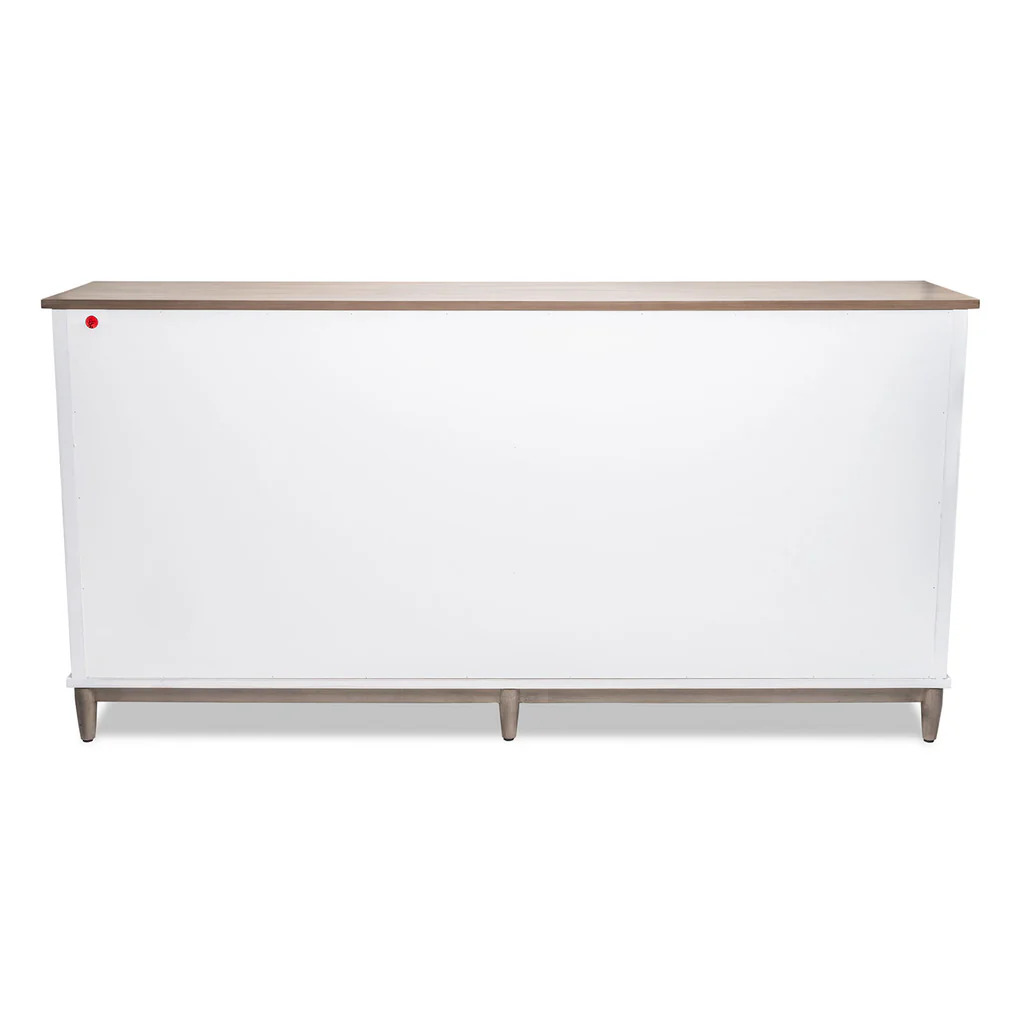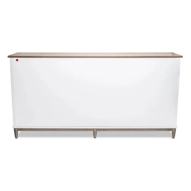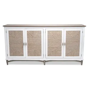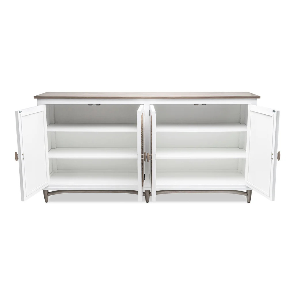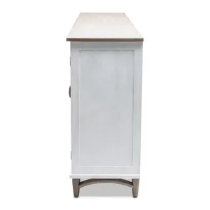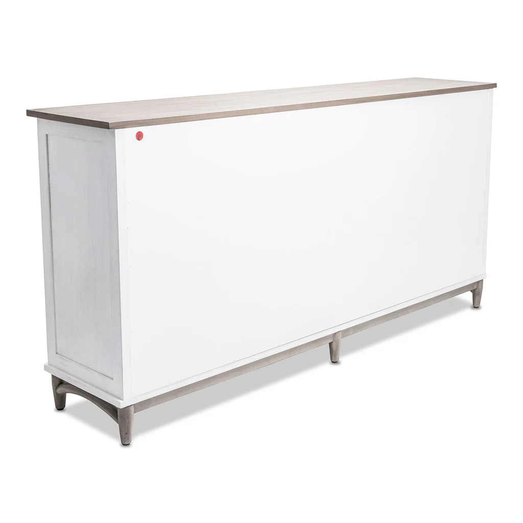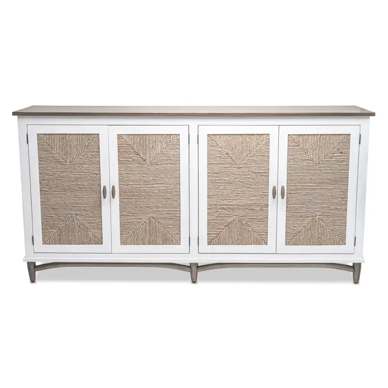 Discover the classic charm of the Port Royale 4-Door Credenza! It's crafted of quality materials, including a solid wood frame, dovetail joints, full extension drawer glides, RUSH fiber, and a beautiful Sea Drift and White finish. Every detail exudes durability and style! So why wait? Bring it home and love it for years to come.
