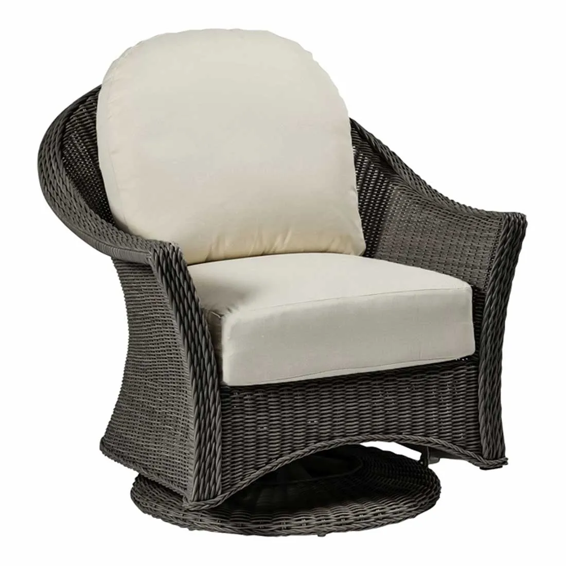 The Regent Swivel Glider is a contemporary woven design that blends generous proportions and delicate curves. Crafted using weather-resistant N-dura™ resin wicker, this chair features intricately twisted detailing and sumptuous cushions for ultimate outdoor living comfort. Available in #24 Oyster & #31 Slate Gray.