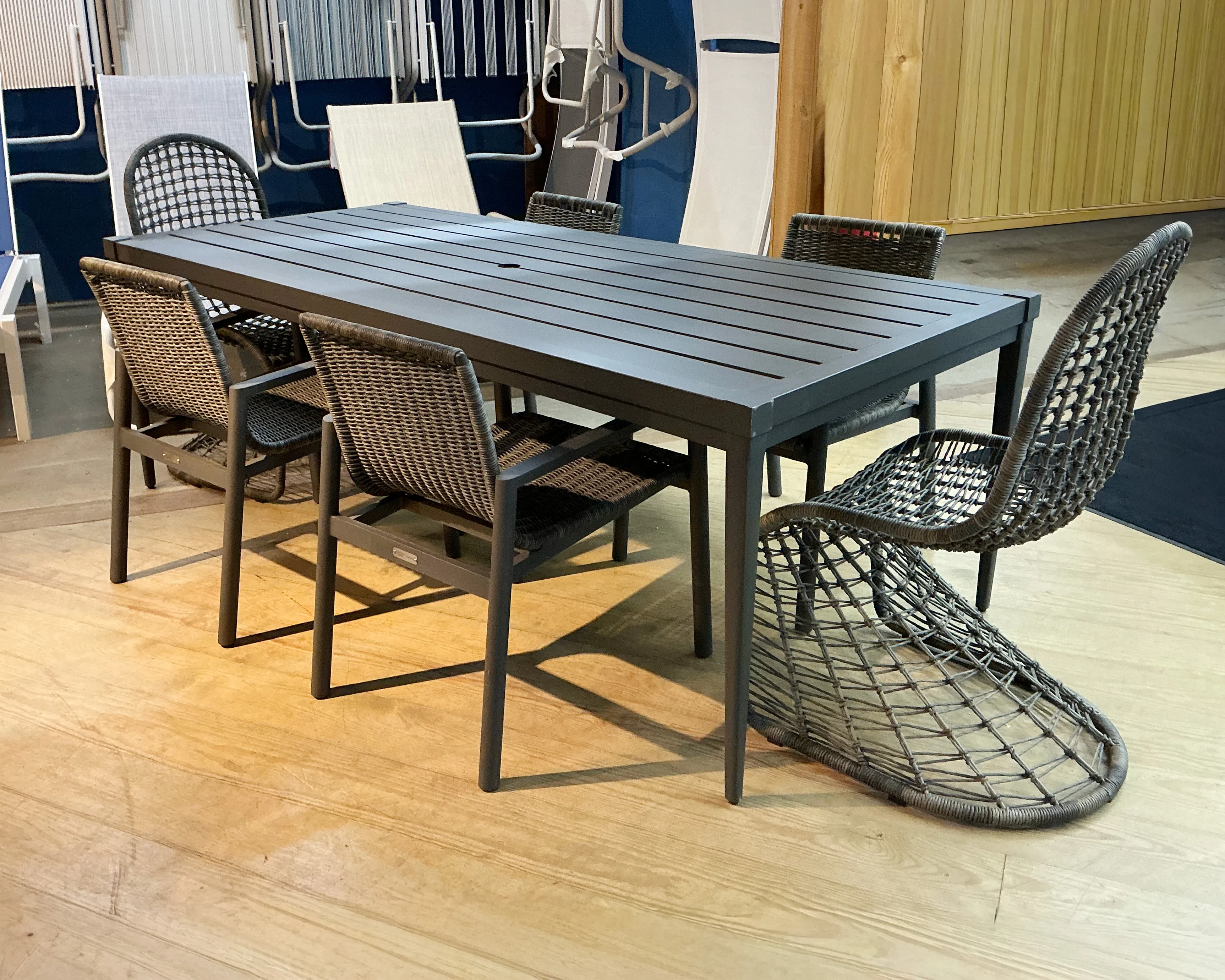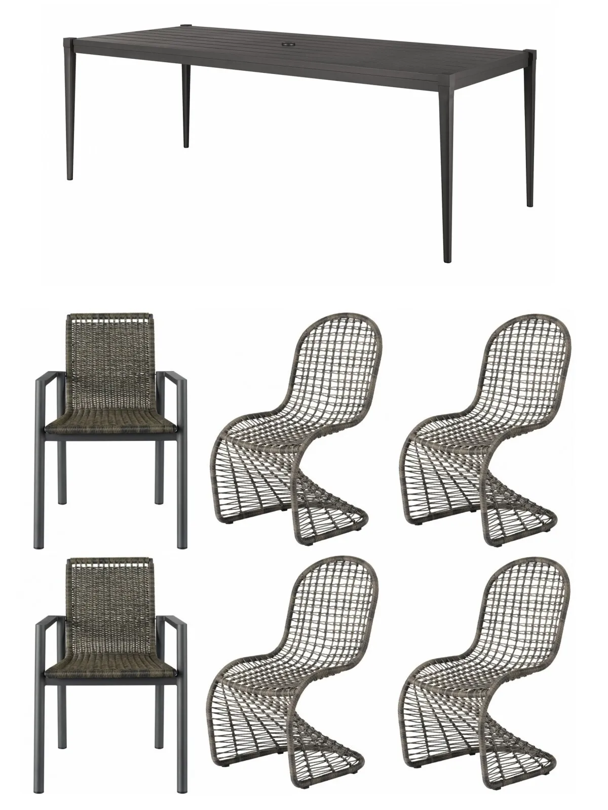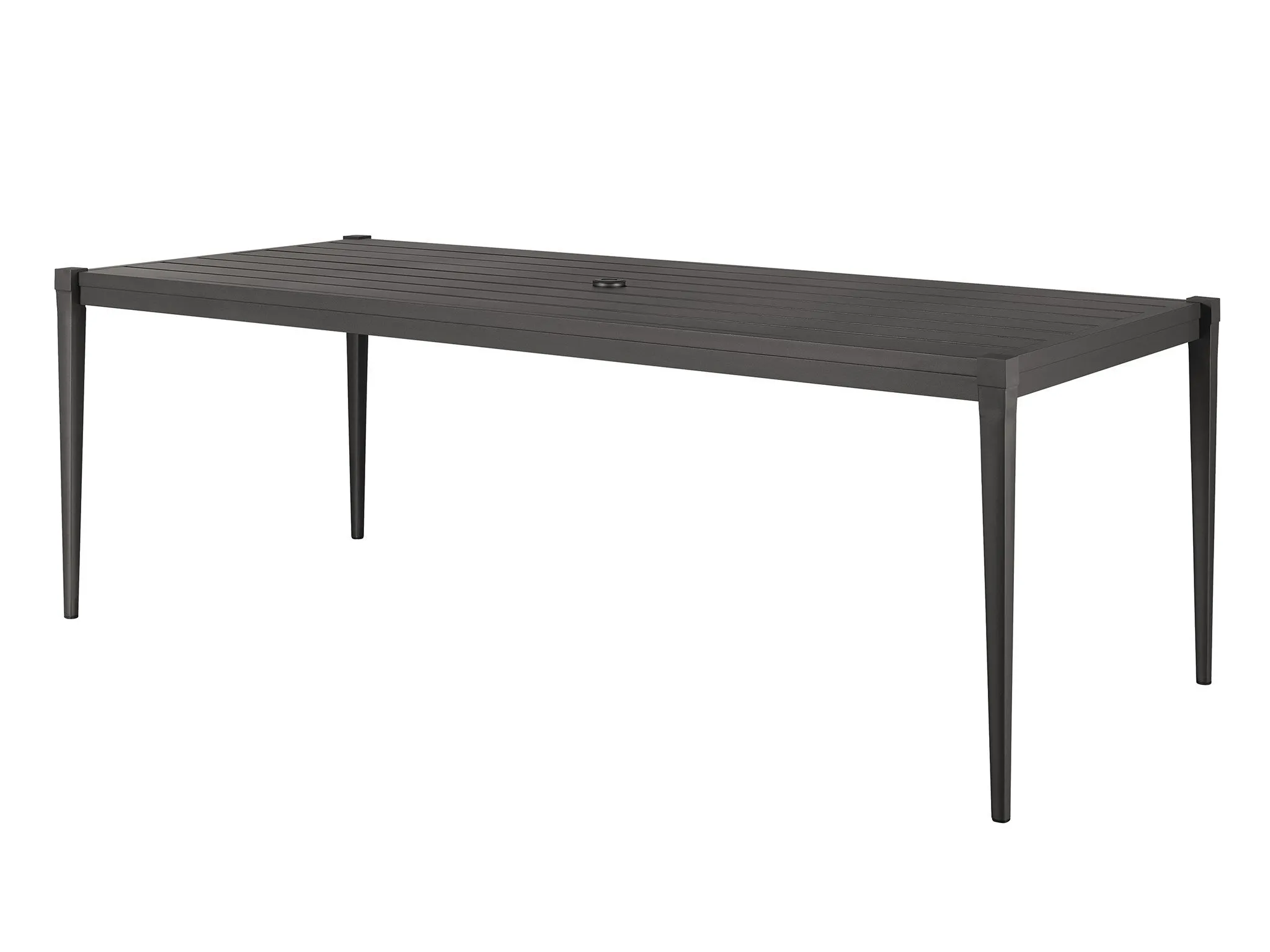 Coastal Living Seneca Dining Table (U012753): 84 x 38 x 29 - A spacious statement piece, the Seneca Dining Table adds dynamic versatility to outdoor dining areas with a bold hue, sleek legs, and a convenient umbrella hole when extra shade is needed.